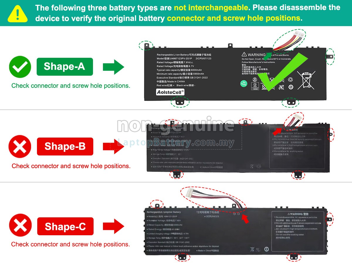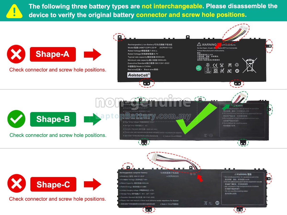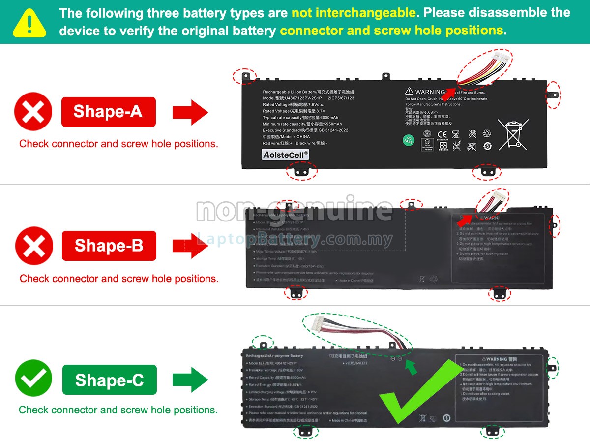 A:First, find out the part number of your old battery or the model name of your laptop (e.g. 'Acer 4964121-2S1P') and then match with our product compatibility table. Second, please compare your old battery with our product images to make sure their shapes are the same. Finally, check the voltage (rating) is the same as the old one. For more details please click How to find one correct battery for my laptop?