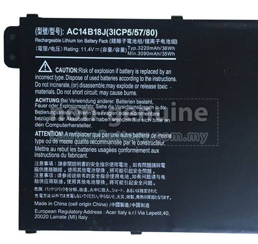 Our Website is your source of high-grade Acer laptop batteries! This brand new 36Wh(3 cells) replacement Acer AC14B18J Li-Polymer battery is made with high-grade cells from Samsung, LG and Panasonic to ensure maximum performance. The housing of the Acer AC14B18J battery pack is made of non flammable and very durable plastic, which is fire-retarded and nonperishable when dropped from low heights.