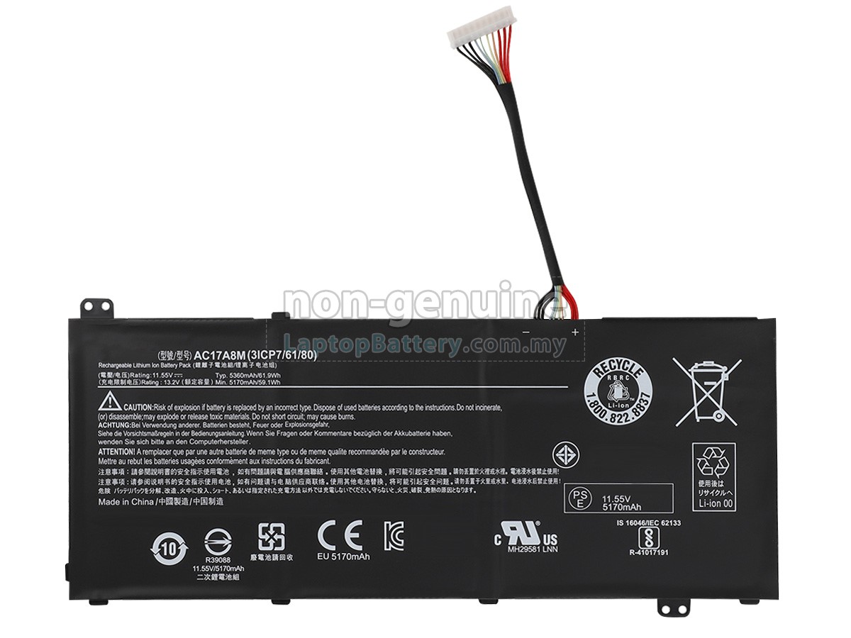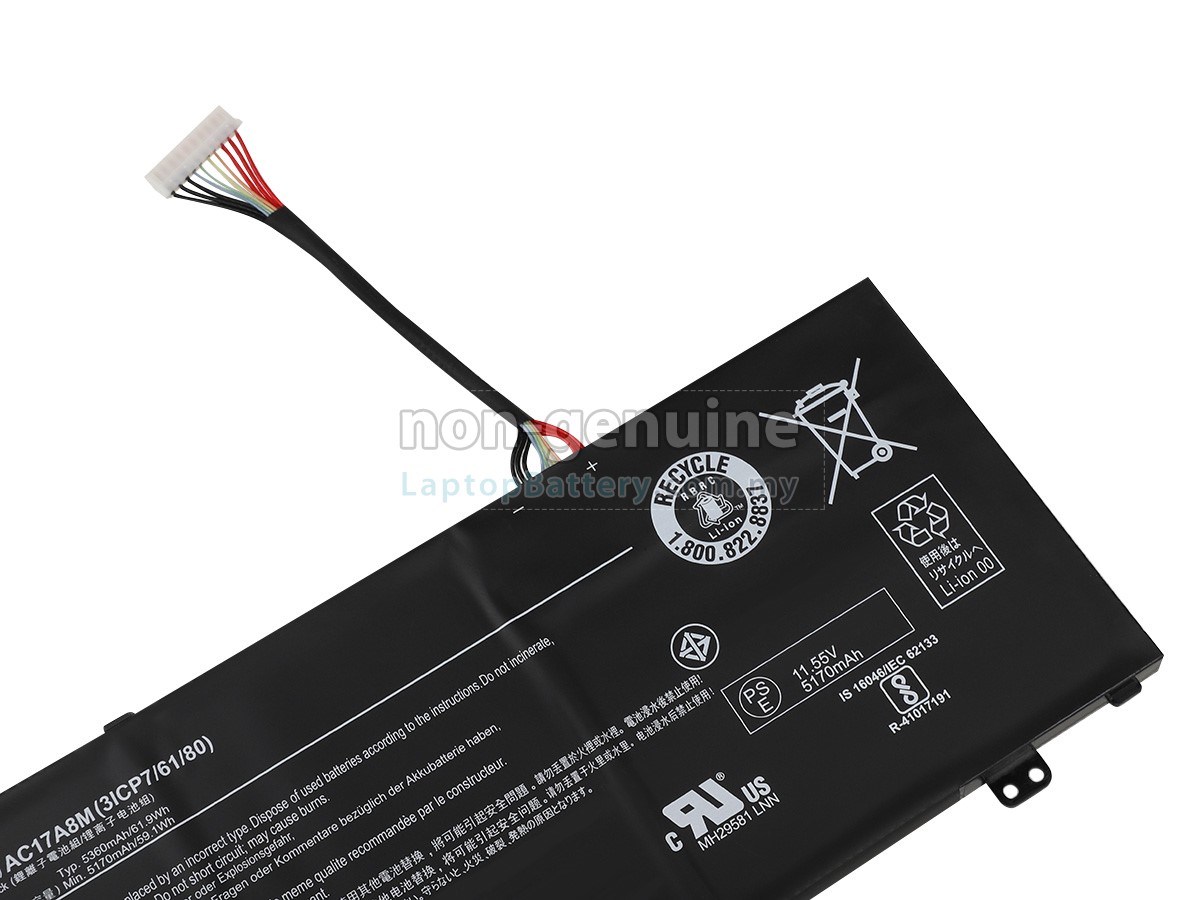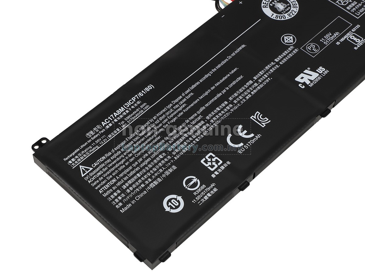 Our Website is your source of high-grade Acer laptop batteries! This brand new 59.1Wh(3 cells) replacement Acer AC17A8M Li-ion battery is made with high-grade cells from Samsung, LG and Panasonic to ensure maximum performance. The housing of the Acer AC17A8M battery pack is made of non flammable and very durable plastic, which is fire-retarded and nonperishable when dropped from low heights.