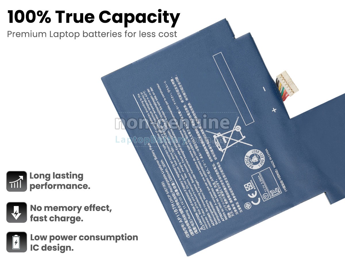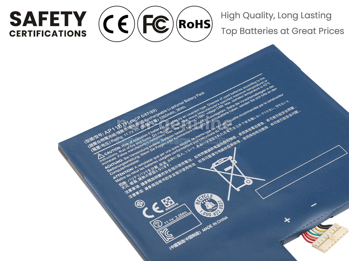 Our Website is your source of high-grade Acer laptop batteries! This brand new 3260mAh(3 cells) replacement Acer AP11B7H Li-Polymer battery is made with high-grade cells from Samsung, LG and Panasonic to ensure maximum performance. The housing of the Acer AP11B7H battery pack is made of non flammable and very durable plastic, which is fire-retarded and nonperishable when dropped from low heights.