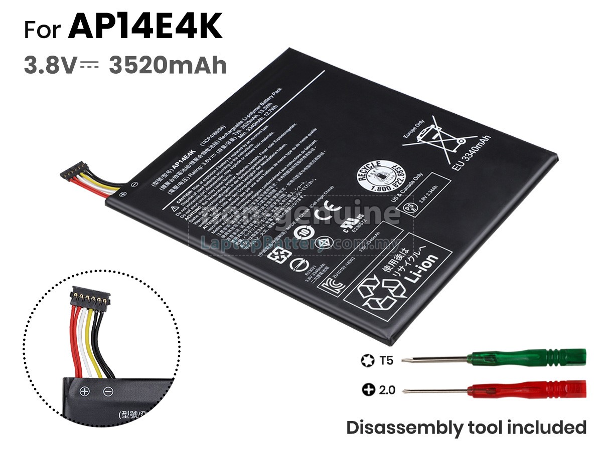 Our Website is your source of high-grade Acer laptop batteries! This brand new 3520mAh(2 cells) replacement Acer KT00104001 Li-Polymer battery is made with high-grade cells from Samsung, LG and Panasonic to ensure maximum performance. The housing of the Acer KT00104001 battery pack is made of non flammable and very durable plastic, which is fire-retarded and nonperishable when dropped from low heights.