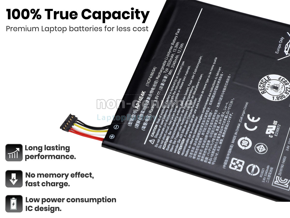 All our high-grade replacement batteries for Acer KT00104001 laptop have been tested to prove that they can match or surpass original Acer battery performance and fit with Original Manufacturer's Specifications. In compliance with international standards, they obtain a series of rigorous safety certifications such as CE, UL, ROHS, ISO9001/9002. In general, this replacement Acer KT00104001 battery can be charged/discharged up to more than 600 cycles.