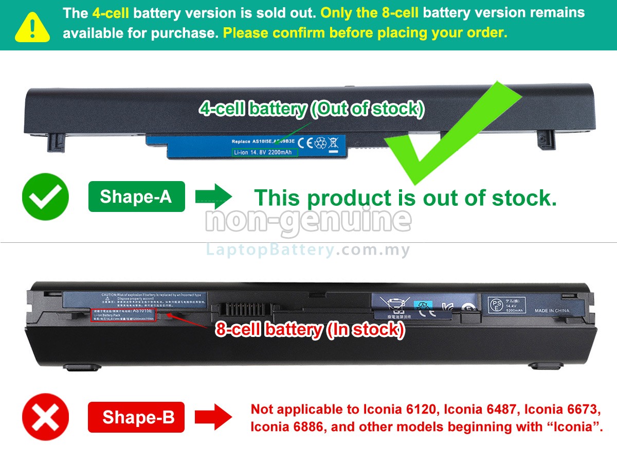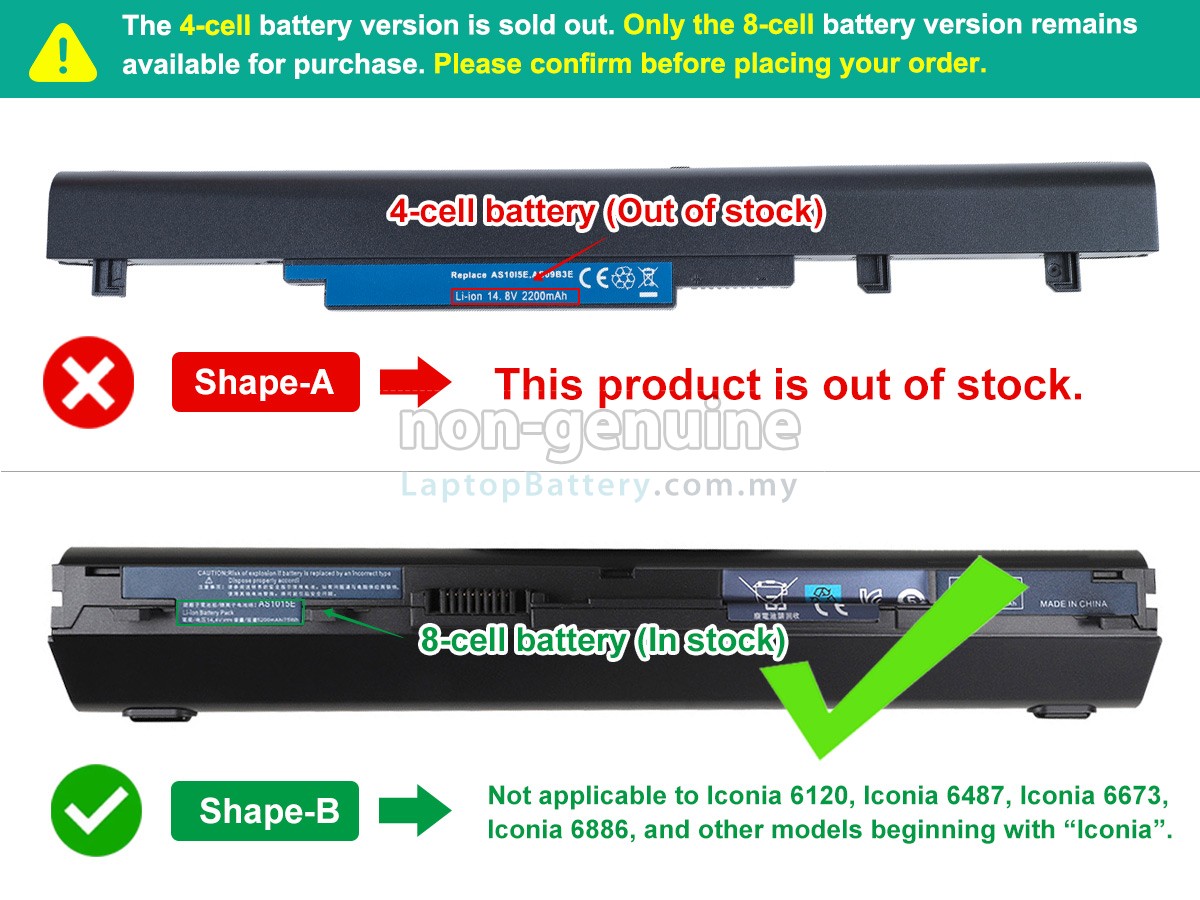 This 8 cells battery not fit for Acer Iconia 6120,Iconia 6487,Iconia 6673,Iconia 6886. And this is a high capacity battery, the bottom of this battery will extend out about 1 inch(bigger size). - SKUMYL314