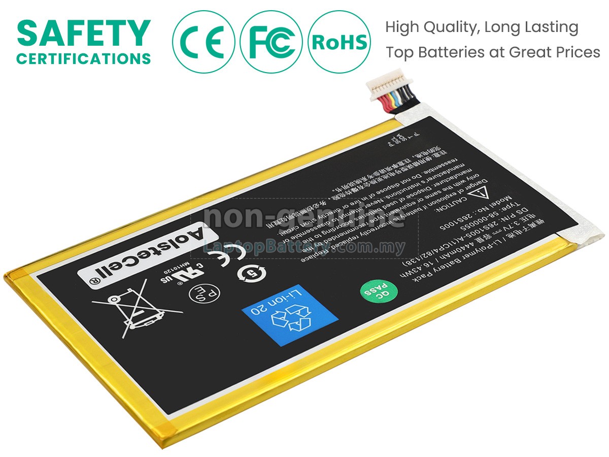 All our high-grade replacement batteries for Amazon KC5 laptop have been tested to prove that they can match or surpass original Amazon battery performance and fit with Original Manufacturer's Specifications. In compliance with international standards, they obtain a series of rigorous safety certifications such as CE, UL, ROHS, ISO9001/9002. In general, this replacement Amazon KC5 battery can be charged/discharged up to more than 600 cycles.