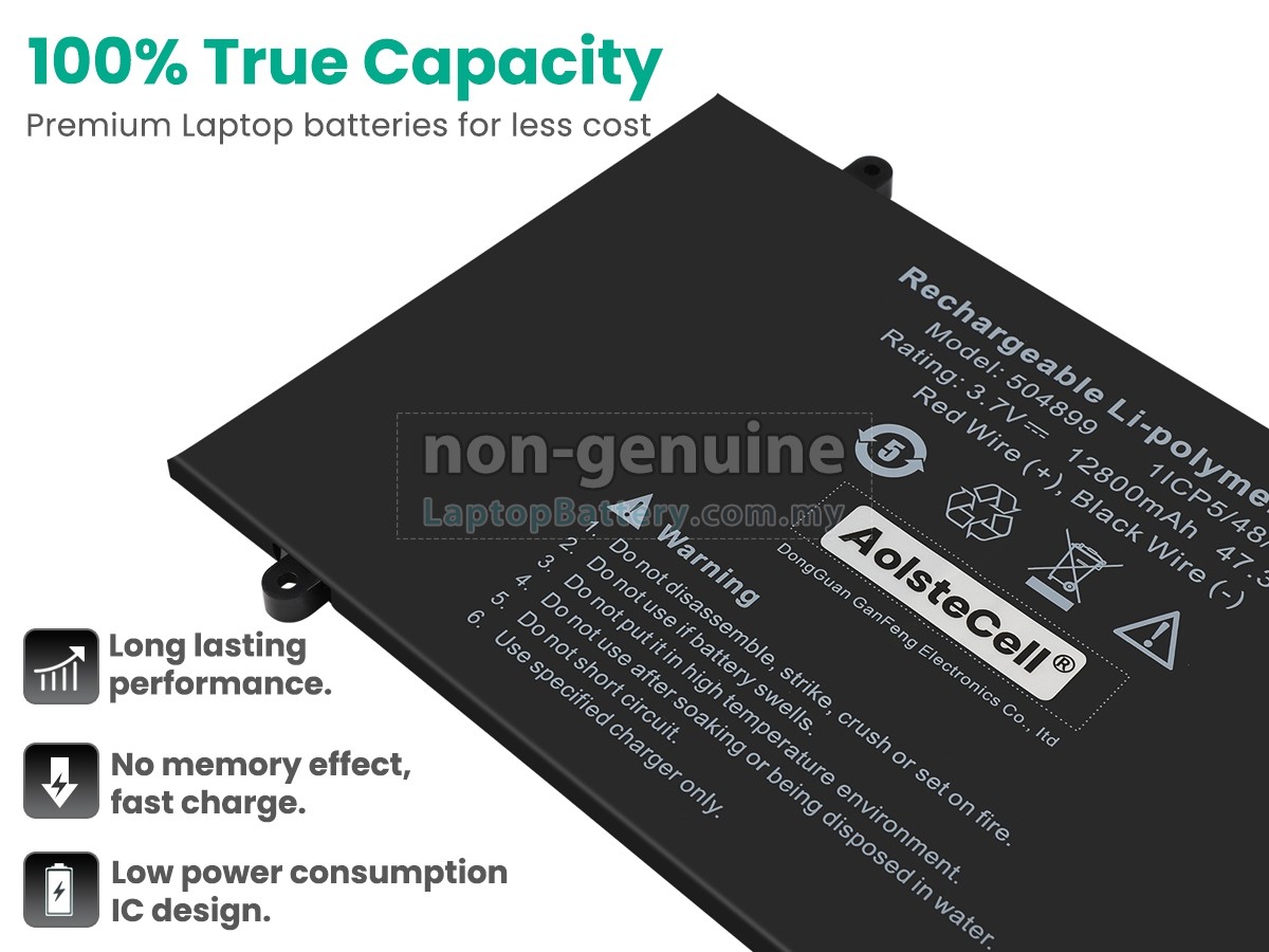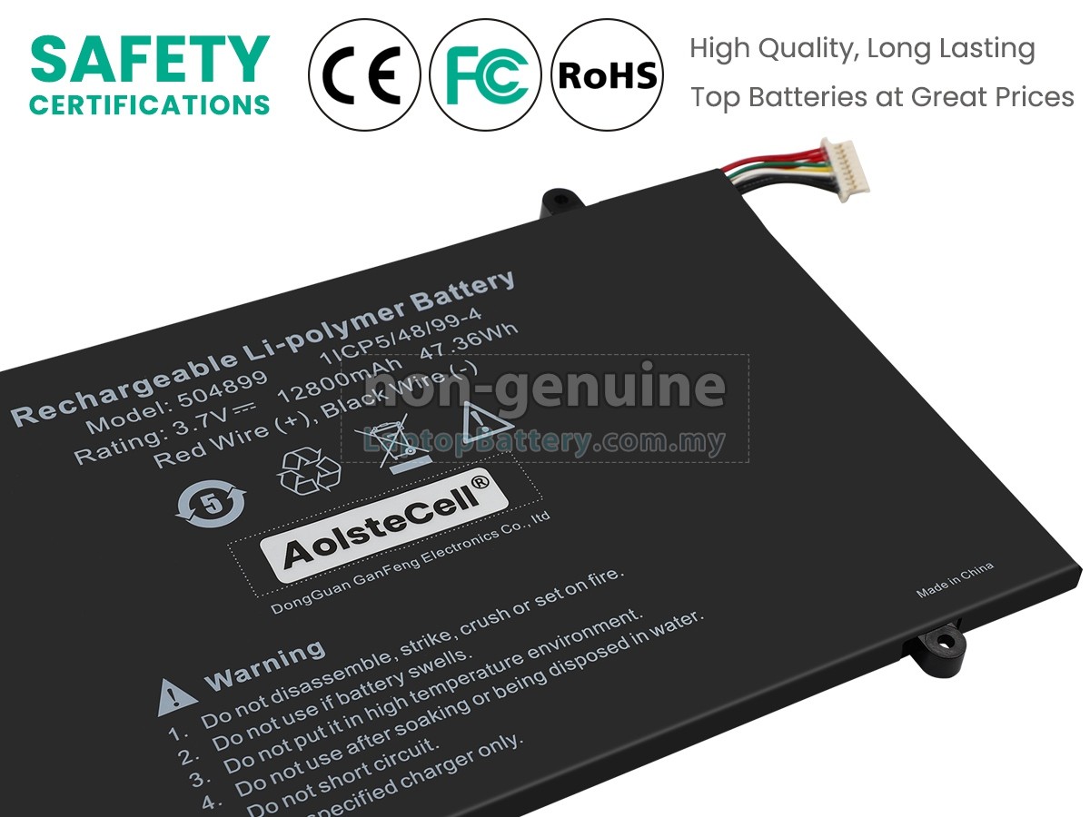 All our high-grade replacement batteries for AolsteCell 504899 laptop have been tested to prove that they can match or surpass original AolsteCell battery performance and fit with Original Manufacturer's Specifications. In compliance with international standards, they obtain a series of rigorous safety certifications such as CE, UL, ROHS, ISO9001/9002. In general, this replacement AolsteCell 504899 battery can be charged/discharged up to more than 600 cycles.