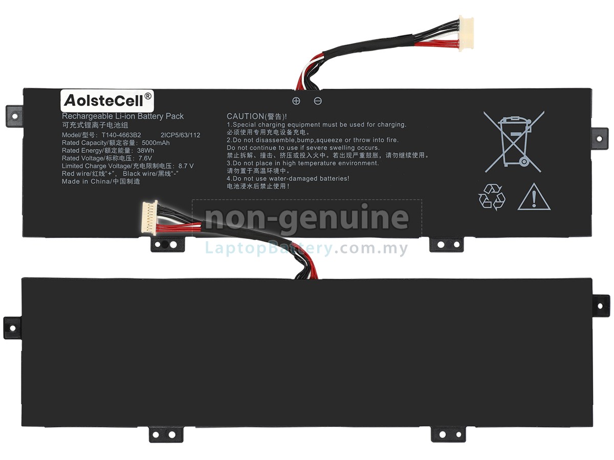 Our Website is your source of high-grade AolsteCell laptop batteries! This brand new 38Wh(2 cells) replacement AolsteCell T140-4663B2 Li-Polymer battery is made with high-grade cells from Samsung, LG and Panasonic to ensure maximum performance. The housing of the AolsteCell T140-4663B2 battery pack is made of non flammable and very durable plastic, which is fire-retarded and nonperishable when dropped from low heights.