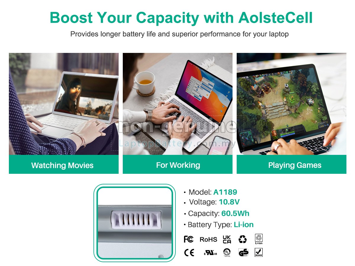 All our high-grade replacement batteries for Apple 17 inch MacBook Pro laptop have been tested to prove that they can match or surpass original Apple battery performance and fit with Original Manufacturer's Specifications. In compliance with international standards, they obtain a series of rigorous safety certifications such as CE, UL, ROHS, ISO9001/9002. In general, this replacement Apple 17 inch MacBook Pro battery can be charged/discharged up to more than 600 cycles.
