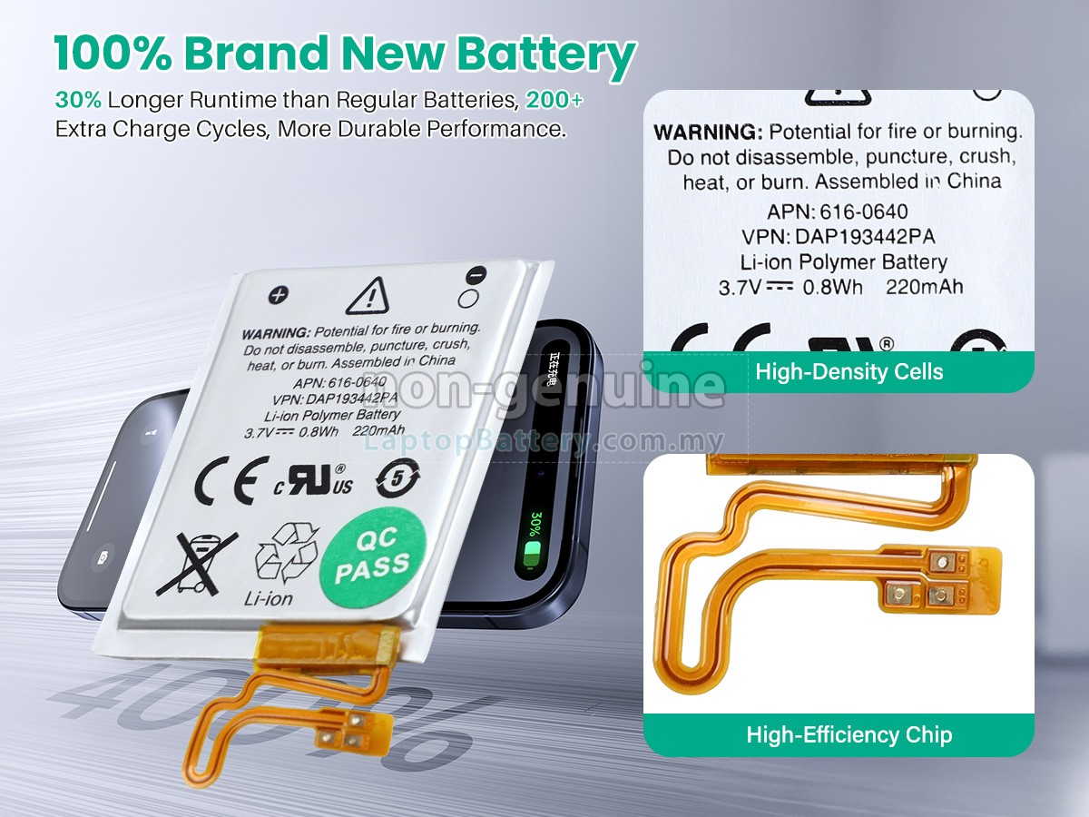 Our Website is your source of high-grade Apple batteries! This brand new 0.8Wh(1 cells) replacement Apple 616-0639 Li-Polymer battery is made with high-grade cells from Samsung, LG and Panasonic to ensure maximum performance. The housing of the Apple 616-0639 battery pack is made of non flammable and very durable plastic, which is fire-retarded and nonperishable when dropped from low heights.