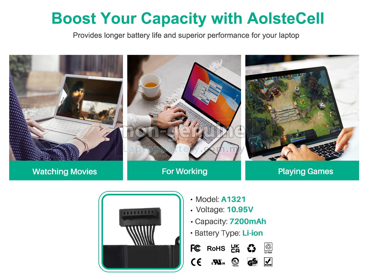 All our high-grade replacement batteries for Apple A1286 EMC 2325 laptop have been tested to prove that they can match or surpass original Apple battery performance and fit with Original Manufacturer's Specifications. In compliance with international standards, they obtain a series of rigorous safety certifications such as CE, UL, ROHS, ISO9001/9002. In general, this replacement Apple A1286 EMC 2325 battery can be charged/discharged up to more than 600 cycles.