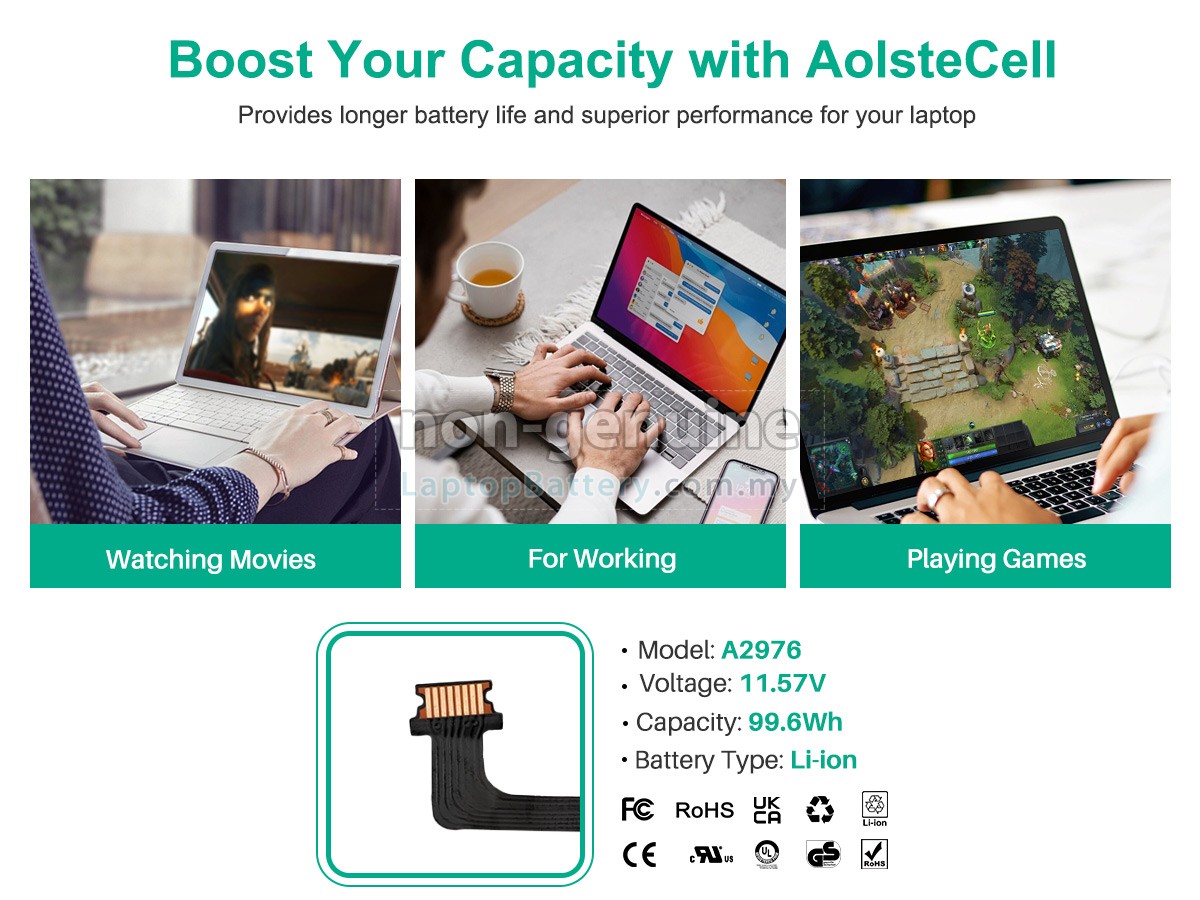 All our high-grade replacement batteries for Apple A2991 laptop have been tested to prove that they can match or surpass original Apple battery performance and fit with Original Manufacturer's Specifications. In compliance with international standards, they obtain a series of rigorous safety certifications such as CE, UL, ROHS, ISO9001/9002. In general, this replacement Apple A2991 battery can be charged/discharged up to more than 600 cycles.