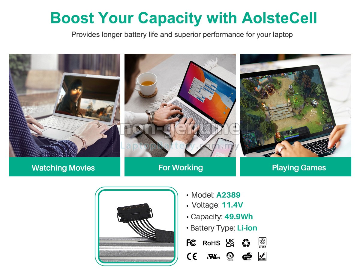 All our high-grade replacement batteries for Apple MacBook Air M1 8-Core A2337 EMC 3598 laptop have been tested to prove that they can match or surpass original Apple battery performance and fit with Original Manufacturer's Specifications. In compliance with international standards, they obtain a series of rigorous safety certifications such as CE, UL, ROHS, ISO9001/9002. In general, this replacement Apple MacBook Air M1 8-Core A2337 EMC 3598 battery can be charged/discharged up to more than 600 cycles.
