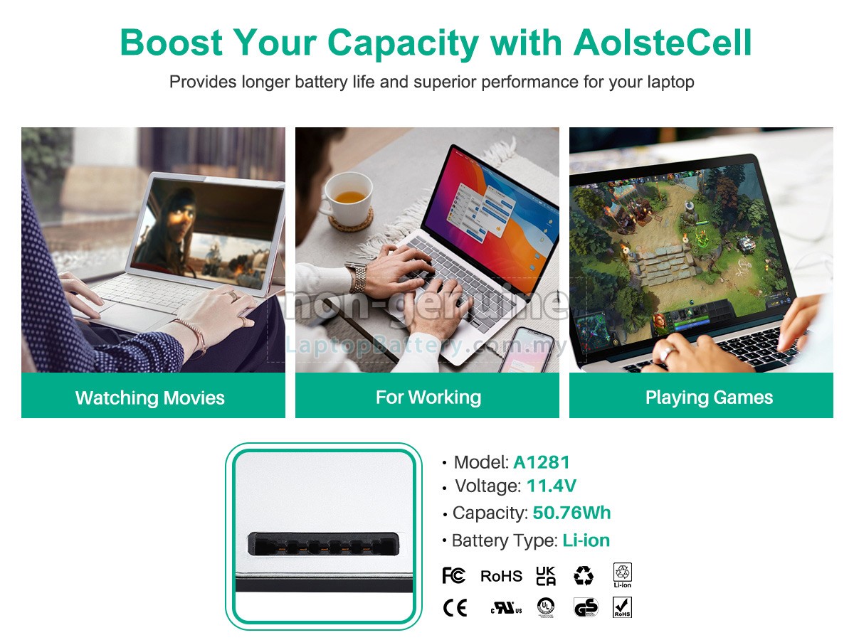 All our high-grade replacement batteries for Apple MacBook Pro 15" MB471LL/A laptop have been tested to prove that they can match or surpass original Apple battery performance and fit with Original Manufacturer's Specifications. In compliance with international standards, they obtain a series of rigorous safety certifications such as CE, UL, ROHS, ISO9001/9002. In general, this replacement Apple MacBook Pro 15" MB471LL/A battery can be charged/discharged up to more than 600 cycles.