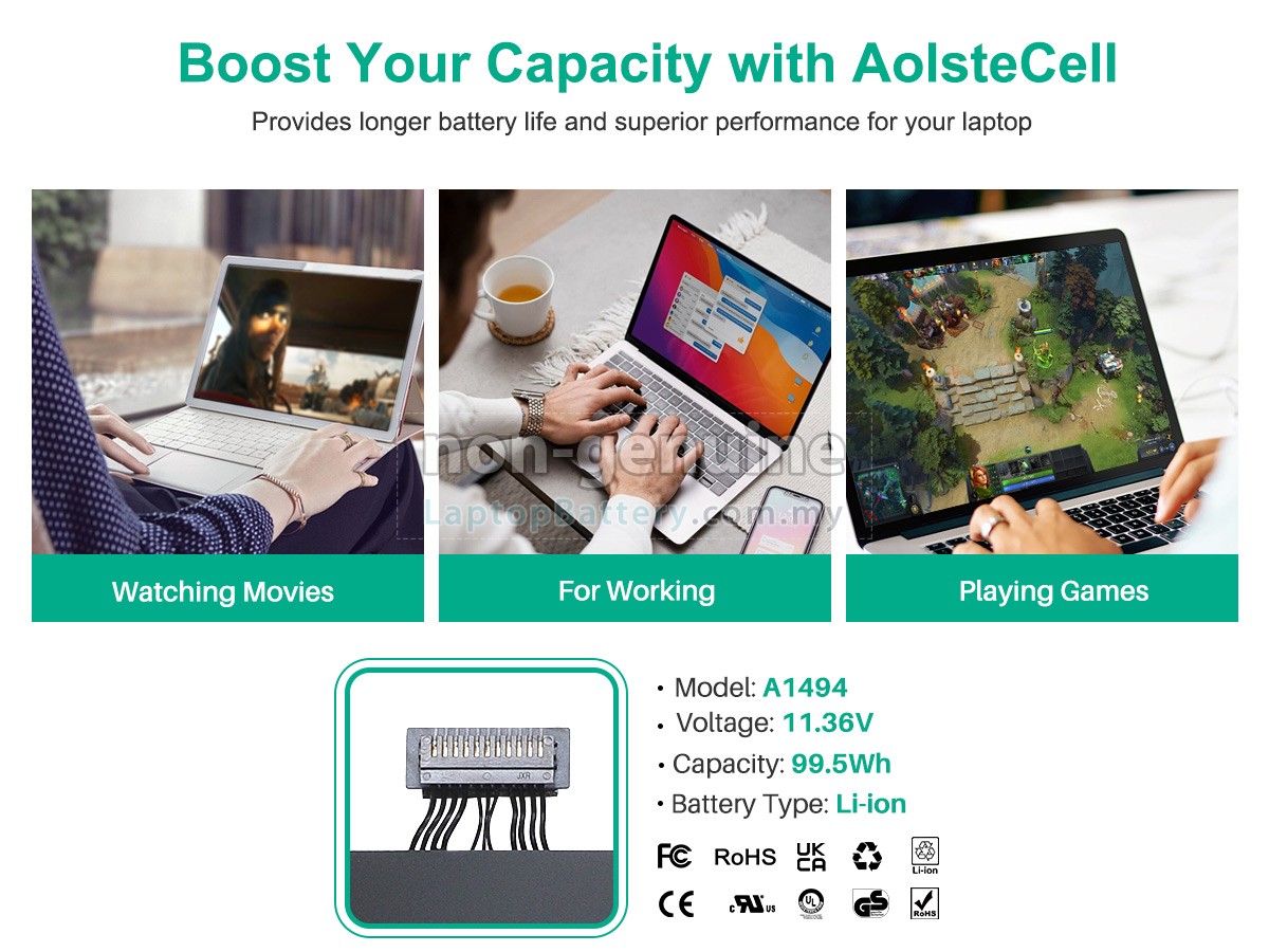 All our high-grade replacement batteries for Apple MacBook Pro Core I7 2.5GHZ 15.4 inch Retina A1398(EMC 2876) laptop have been tested to prove that they can match or surpass original Apple battery performance and fit with Original Manufacturer's Specifications. In compliance with international standards, they obtain a series of rigorous safety certifications such as CE, UL, ROHS, ISO9001/9002. In general, this replacement Apple MacBook Pro Core I7 2.5GHZ 15.4 inch Retina A1398(EMC 2876) battery can be charged/discharged up to more than 600 cycles.