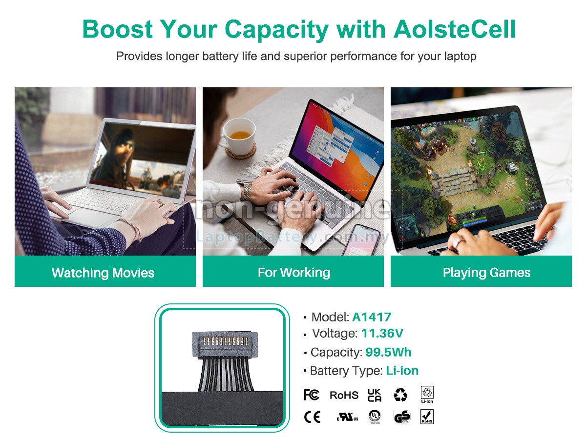 All our high-grade replacement batteries for Apple MacBook Pro Core I7 2.7GHZ 15.5 inch Retina A1398(EMC 2512) laptop have been tested to prove that they can match or surpass original Apple battery performance and fit with Original Manufacturer's Specifications. In compliance with international standards, they obtain a series of rigorous safety certifications such as CE, UL, ROHS, ISO9001/9002. In general, this replacement Apple MacBook Pro Core I7 2.7GHZ 15.5 inch Retina A1398(EMC 2512) battery can be charged/discharged up to more than 600 cycles.