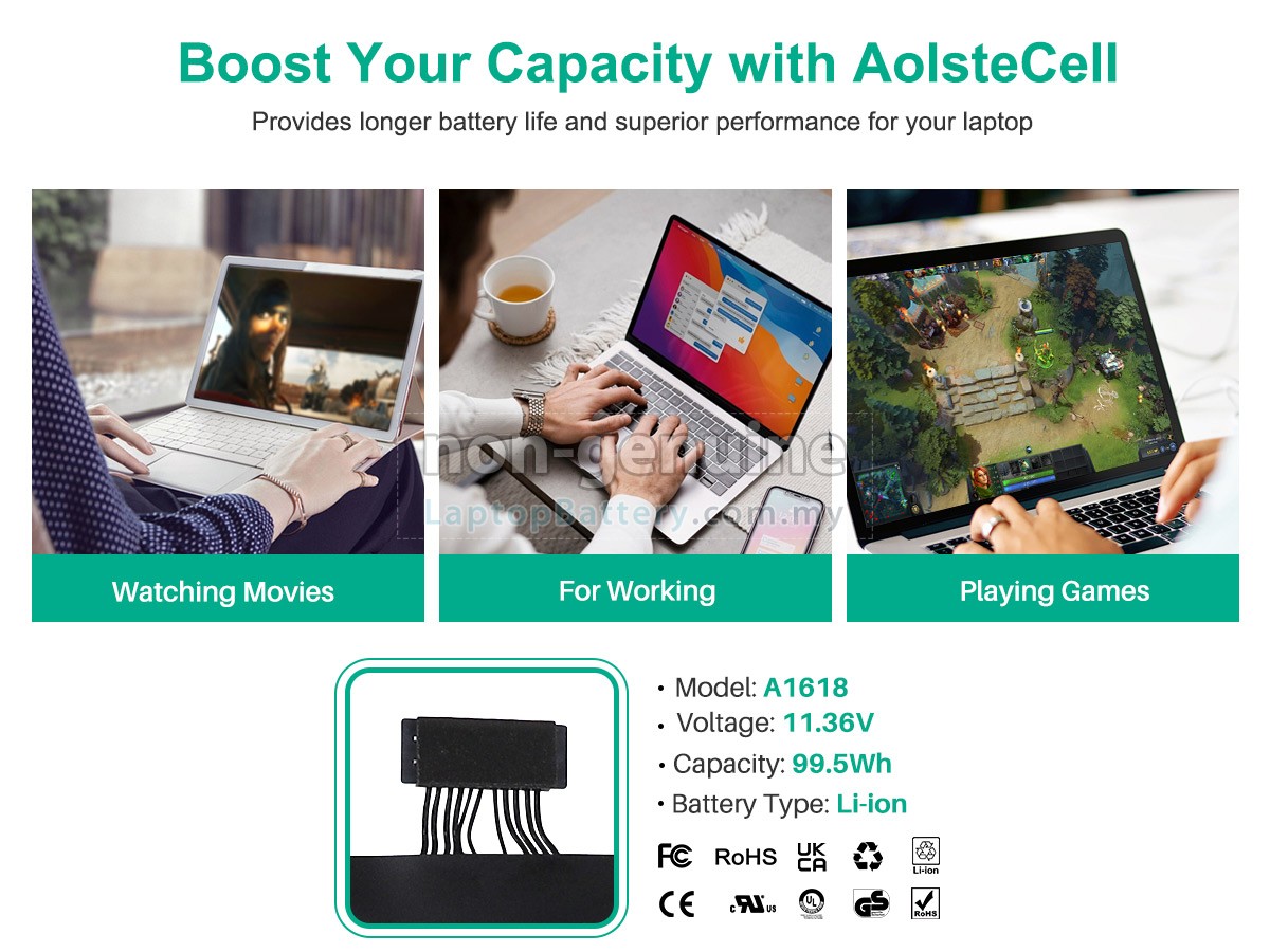 All our high-grade replacement batteries for Apple MacBook Pro Core I7 2.8GHZ 15.4 inch Retina A1398(EMC 2909) laptop have been tested to prove that they can match or surpass original Apple battery performance and fit with Original Manufacturer's Specifications. In compliance with international standards, they obtain a series of rigorous safety certifications such as CE, UL, ROHS, ISO9001/9002. In general, this replacement Apple MacBook Pro Core I7 2.8GHZ 15.4 inch Retina A1398(EMC 2909) battery can be charged/discharged up to more than 600 cycles.