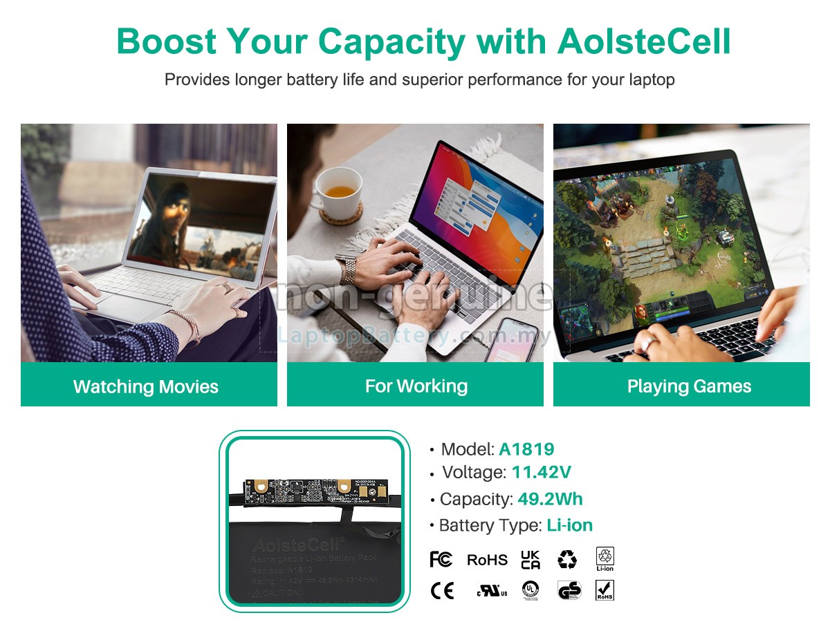 All our high-grade replacement batteries for Apple MacBook Pro Core I7 3.5 13 inch TOUCH A1706(Mid 2017) laptop have been tested to prove that they can match or surpass original Apple battery performance and fit with Original Manufacturer's Specifications. In compliance with international standards, they obtain a series of rigorous safety certifications such as CE, UL, ROHS, ISO9001/9002. In general, this replacement Apple MacBook Pro Core I7 3.5 13 inch TOUCH A1706(Mid 2017) battery can be charged/discharged up to more than 600 cycles.