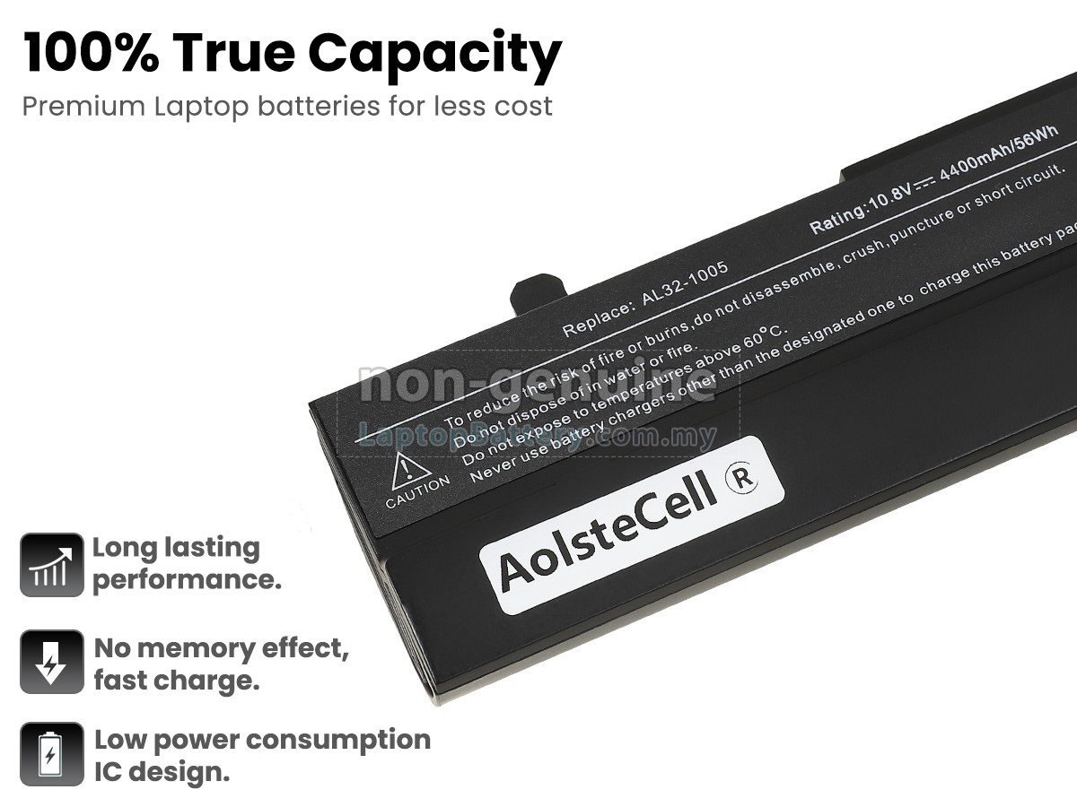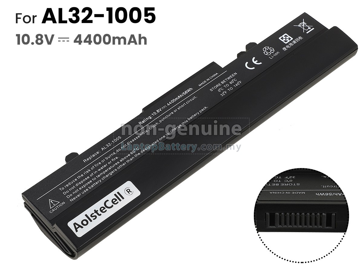 Our Website is your source of high-grade Asus laptop batteries! This brand new 4400mAh(6 cells) replacement Asus AL31-1005 Li-ion battery is made with high-grade cells from Samsung, LG and Panasonic to ensure maximum performance. The housing of the Asus AL31-1005 battery pack is made of non flammable and very durable plastic, which is fire-retarded and nonperishable when dropped from low heights.