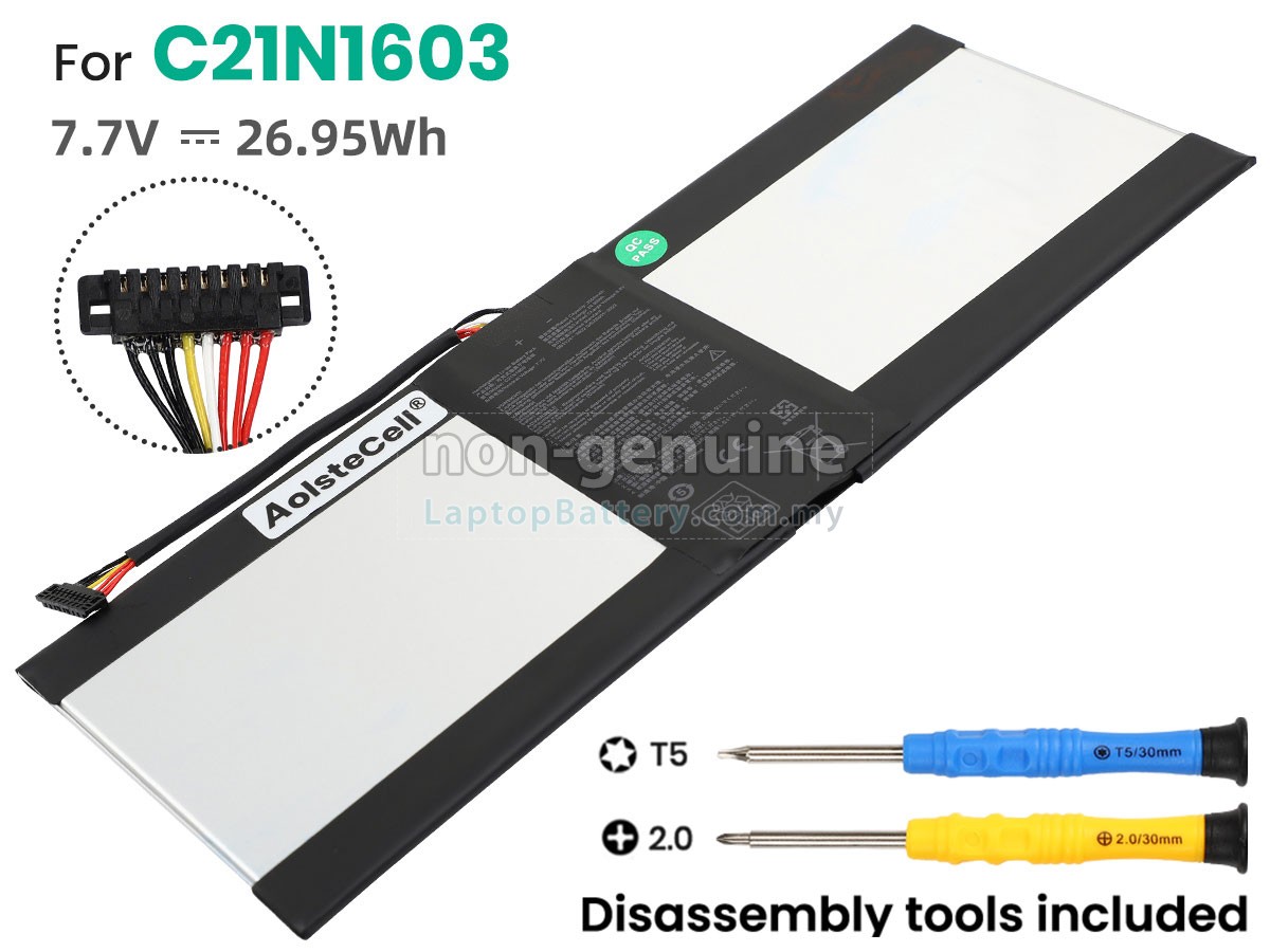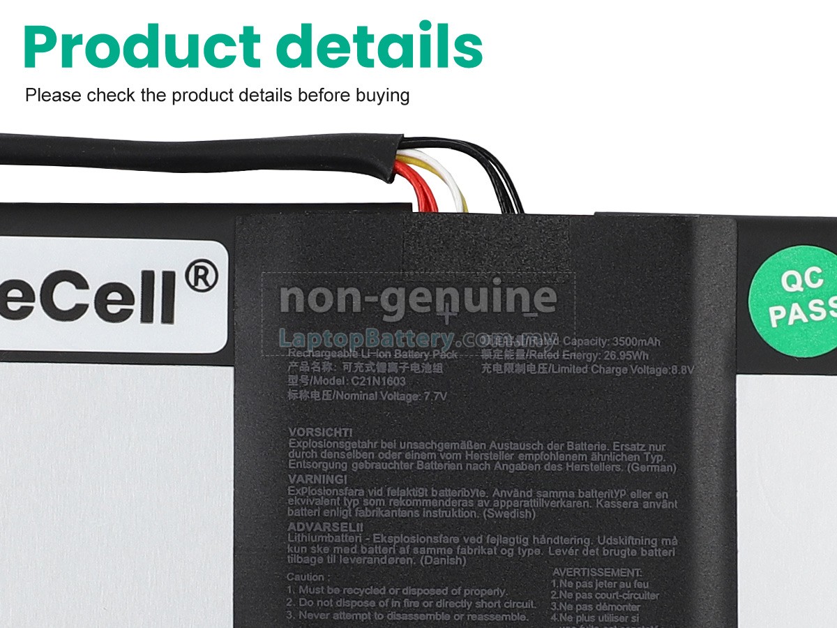 Our Website is your source of high-grade Asus laptop batteries! This brand new 26.95Wh(2 cells) replacement Asus C21N1603 Li-ion battery is made with high-grade cells from Samsung, LG and Panasonic to ensure maximum performance. The housing of the Asus C21N1603 battery pack is made of non flammable and very durable plastic, which is fire-retarded and nonperishable when dropped from low heights.