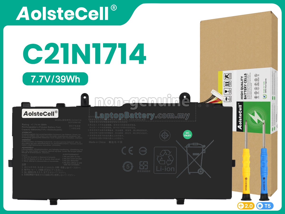 Our Website is your source of high-grade Asus laptop batteries! This brand new 39Wh(2 cells) replacement Asus C21N1714 Li-Polymer battery is made with high-grade cells from Samsung, LG and Panasonic to ensure maximum performance. The housing of the Asus C21N1714 battery pack is made of non flammable and very durable plastic, which is fire-retarded and nonperishable when dropped from low heights.