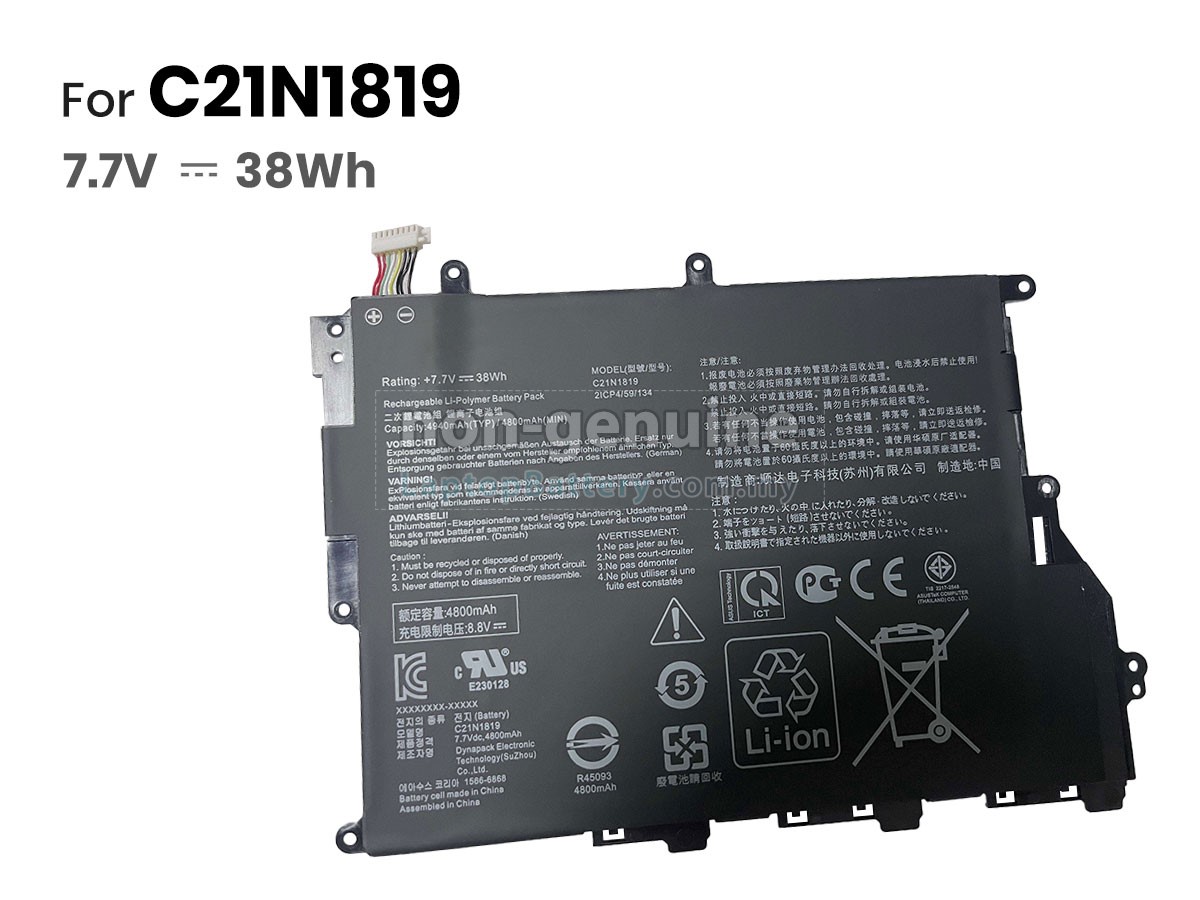 Our Website is your source of high-grade Asus laptop batteries! This brand new 38Wh(2 cells) replacement Asus C21N1819 Li-Polymer battery is made with high-grade cells from Samsung, LG and Panasonic to ensure maximum performance. The housing of the Asus C21N1819 battery pack is made of non flammable and very durable plastic, which is fire-retarded and nonperishable when dropped from low heights.