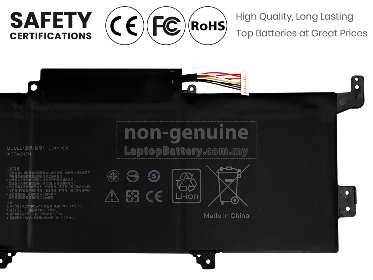 Our Website is your source of high-grade Asus laptop batteries! This brand new 57Wh(3 cells) replacement Asus C31N1602 Li-Polymer battery is made with high-grade cells from Samsung, LG and Panasonic to ensure maximum performance. The housing of the Asus C31N1602 battery pack is made of non flammable and very durable plastic, which is fire-retarded and nonperishable when dropped from low heights.
