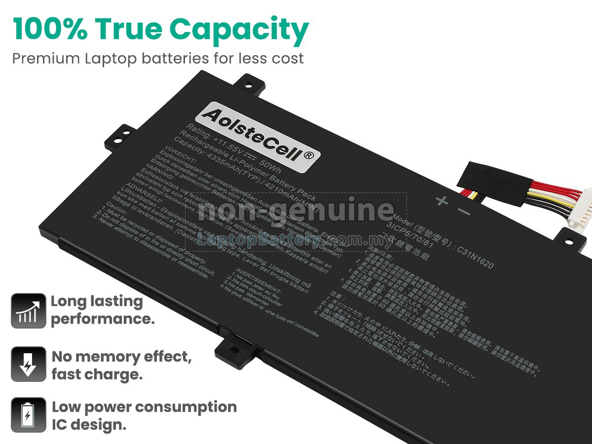 Our Website is your source of high-grade Asus laptop batteries! This brand new 50Wh(3 cells) replacement Asus C31N1620-L Li-Polymer battery is made with high-grade cells from Samsung, LG and Panasonic to ensure maximum performance. The housing of the Asus C31N1620-L battery pack is made of non flammable and very durable plastic, which is fire-retarded and nonperishable when dropped from low heights.