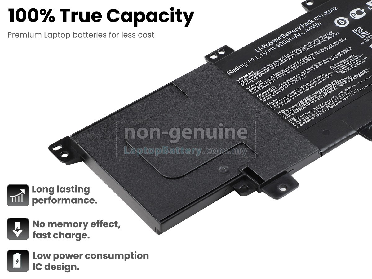 All our high quality replacement batteries for Asus VivoBook S500C laptop come with a 1-year warranty. Warranty is applicable if the buyer has installed the battery properly in the device and has treated the battery correctly.