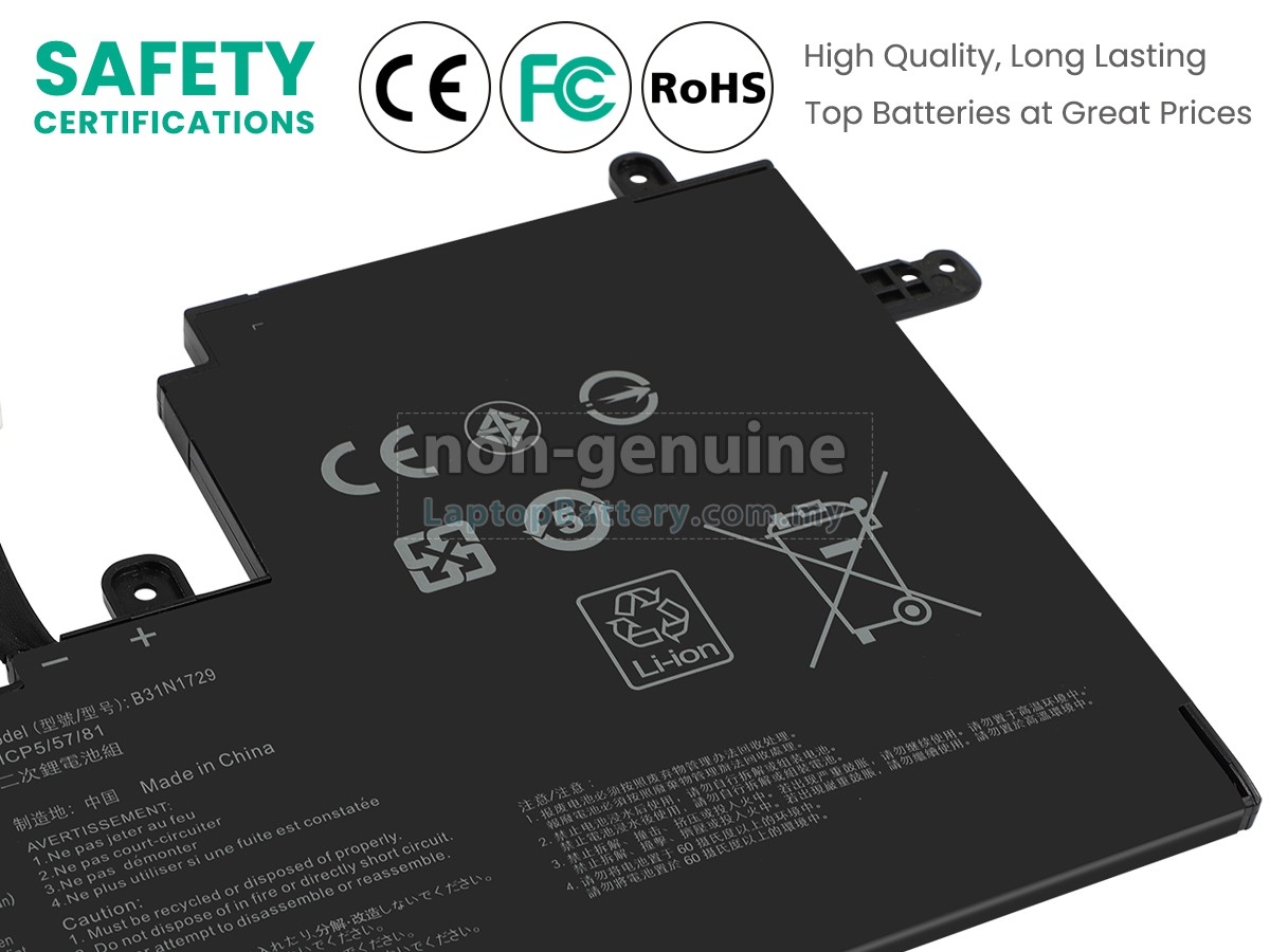 All our high-grade replacement batteries for Asus VivoBook X530UA laptop have been tested to prove that they can match or surpass original Asus battery performance and fit with Original Manufacturer's Specifications. In compliance with international standards, they obtain a series of rigorous safety certifications such as CE, UL, ROHS, ISO9001/9002. In general, this replacement Asus VivoBook X530UA battery can be charged/discharged up to more than 600 cycles.