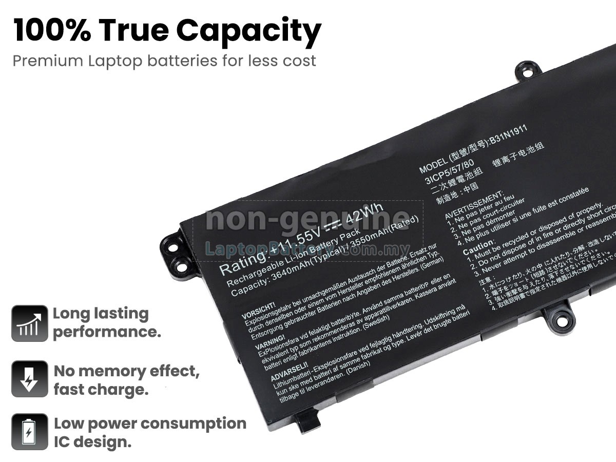 Our Website is your source of high-grade Asus laptop batteries! This brand new 42Wh(3 cells) replacement Asus X421EA Li-Polymer battery is made with high-grade cells from Samsung, LG and Panasonic to ensure maximum performance. The housing of the Asus X421EA battery pack is made of non flammable and very durable plastic, which is fire-retarded and nonperishable when dropped from low heights.