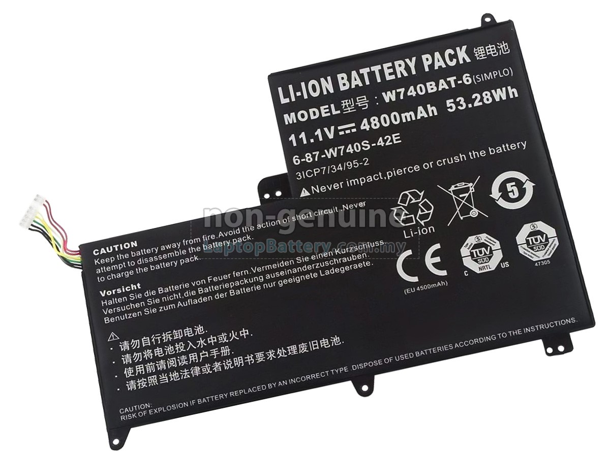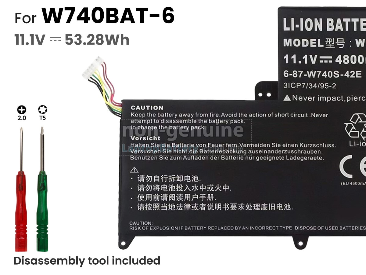 Our Website is your source of high-grade Clevo laptop batteries! This brand new 53.28Wh(3 cells) replacement Clevo W740BAT-6 Li-Polymer battery is made with high-grade cells from Samsung, LG and Panasonic to ensure maximum performance. The housing of the Clevo W740BAT-6 battery pack is made of non flammable and very durable plastic, which is fire-retarded and nonperishable when dropped from low heights.