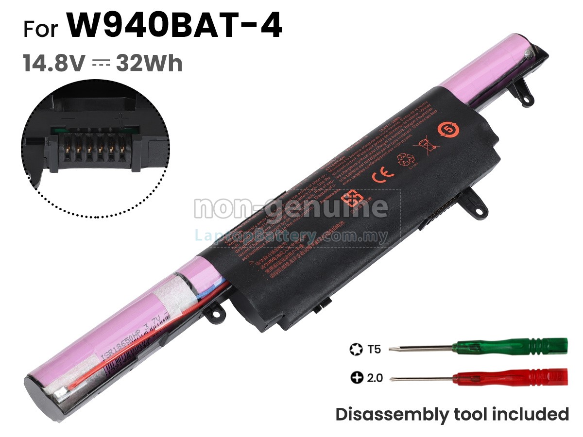 Our Website is your source of high-grade Clevo laptop batteries! This brand new 32Wh(4 cells) replacement Clevo W940JU Li-ion battery is made with high-grade cells from Samsung, LG and Panasonic to ensure maximum performance. The housing of the Clevo W940JU battery pack is made of non flammable and very durable plastic, which is fire-retarded and nonperishable when dropped from low heights.