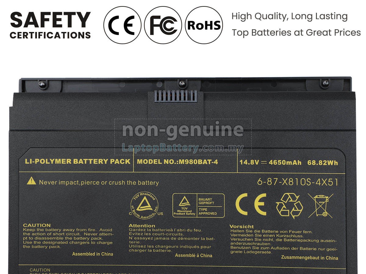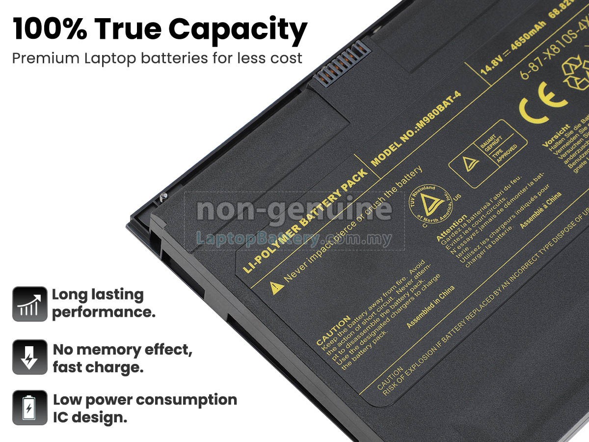 Our Website is your source of high-grade Clevo laptop batteries! This brand new 68.82Wh(4 cells) replacement Clevo X8100 Li-ion battery is made with high-grade cells from Samsung, LG and Panasonic to ensure maximum performance. The housing of the Clevo X8100 battery pack is made of non flammable and very durable plastic, which is fire-retarded and nonperishable when dropped from low heights.