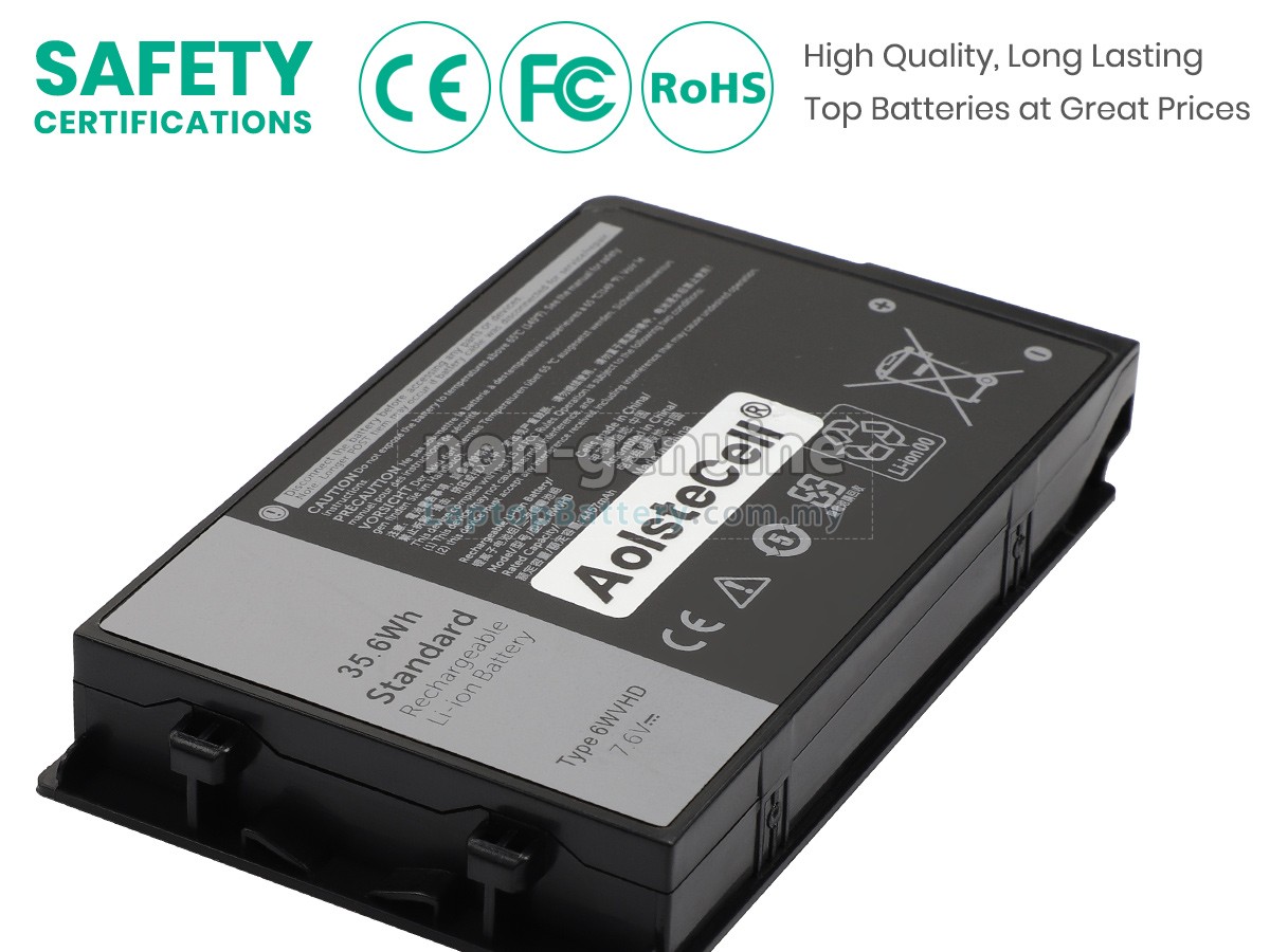 Our Website is your source of high-grade Dell laptop batteries! This brand new 35.6Wh(4 cells) replacement Dell 6WVHD Li-ion battery is made with high-grade cells from Samsung, LG and Panasonic to ensure maximum performance. The housing of the Dell 6WVHD battery pack is made of non flammable and very durable plastic, which is fire-retarded and nonperishable when dropped from low heights.