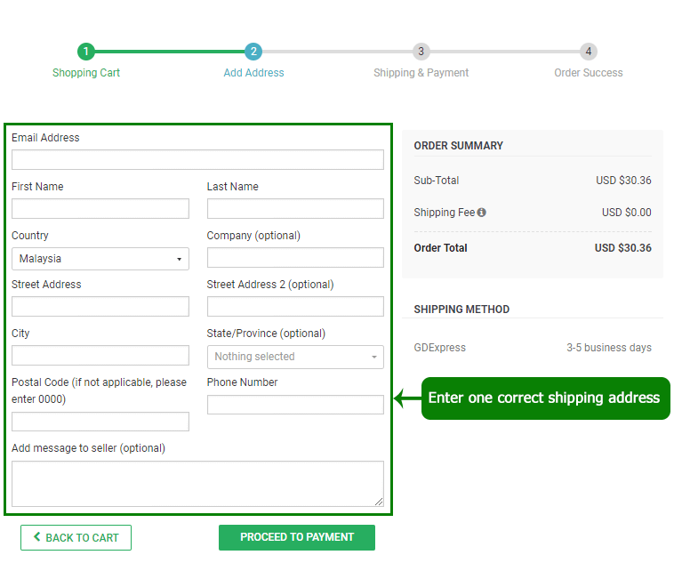 3The first checkout page is "Add Shipping Address",you can add or change shipping address, and enter "Special Instructions Or Comments" for your order. e.g. to an different dropship address.
