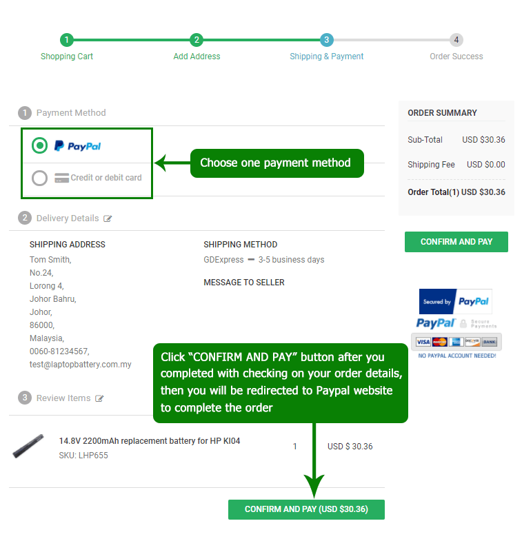 5Click "Confirm and pay" to create your order first and then be immediately directed to Paypal to complete your payment. You will receive an email confirming your order information.
