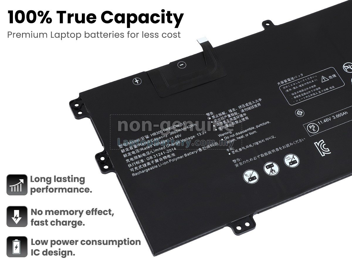 All our high-grade replacement batteries for Huawei EUL-W19P laptop have been tested to prove that they can match or surpass original Huawei battery performance and fit with Original Manufacturer's Specifications. In compliance with international standards, they obtain a series of rigorous safety certifications such as CE, UL, ROHS, ISO9001/9002. In general, this replacement Huawei EUL-W19P battery can be charged/discharged up to more than 600 cycles.