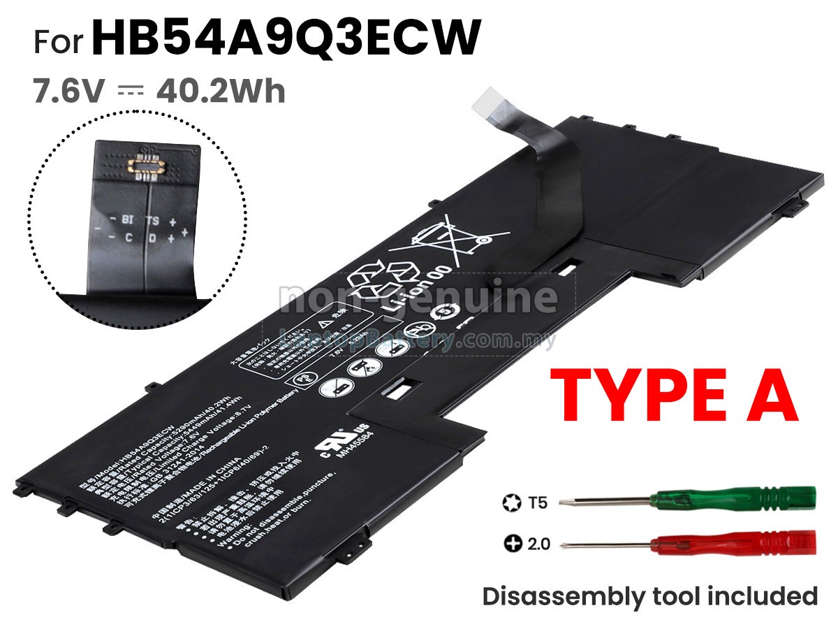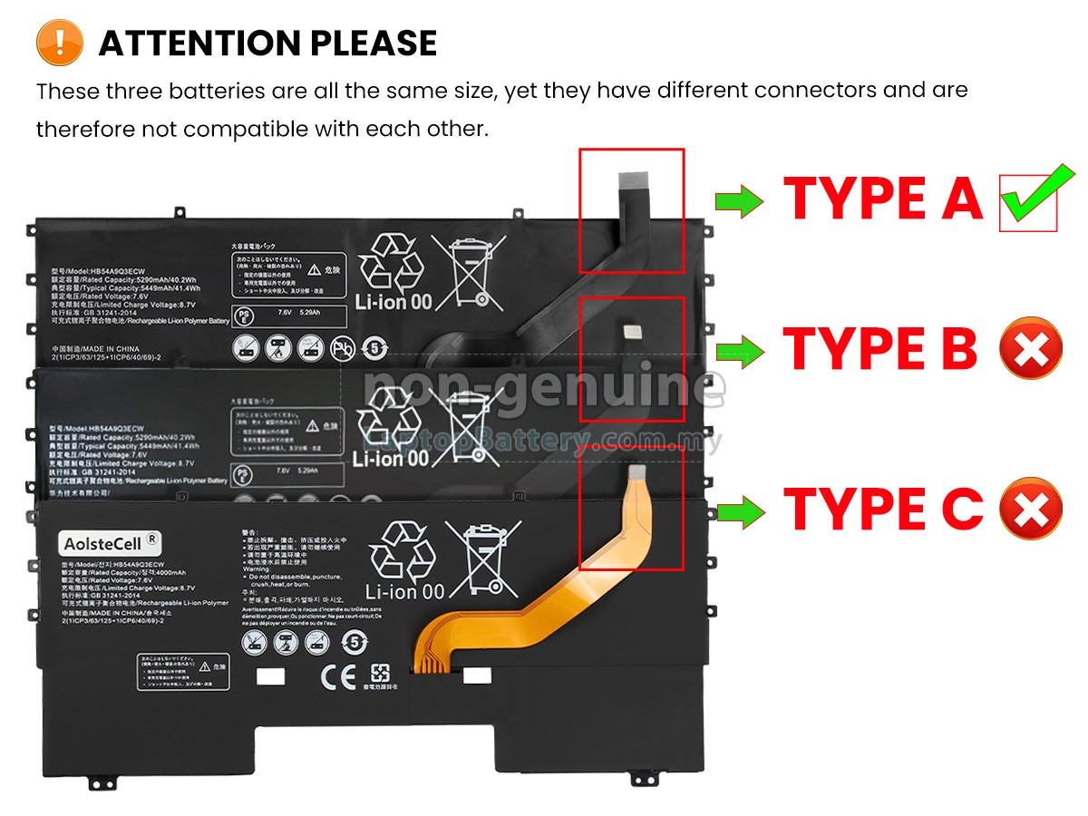 There are 3 types battery named "HB54A9Q3ECW", before placing an order please check your old battery first, ensure the connector is same to our battery Type A. - SKUMYL1094