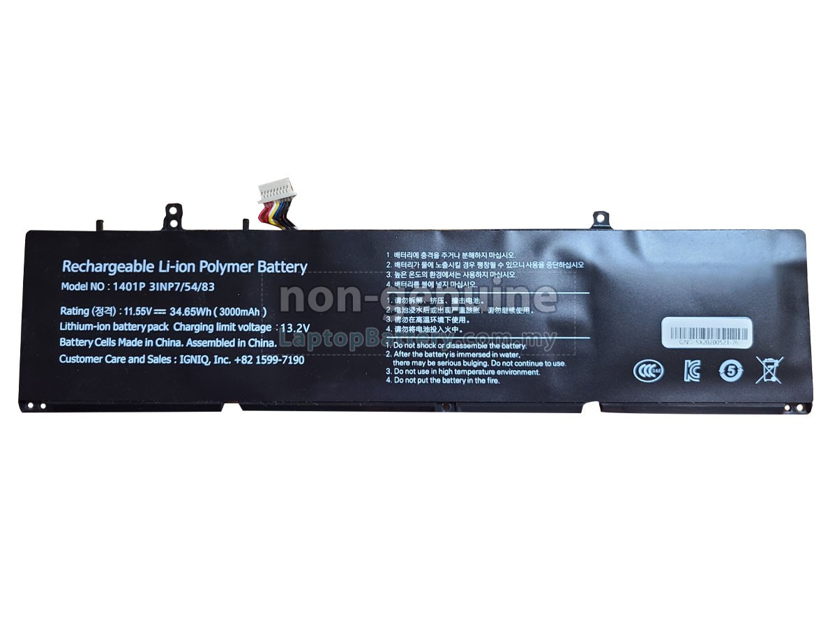 Our Website is your source of high-grade IGNIQ laptop batteries! This brand new 34.65Wh(3 cells) replacement IGNIQ BYBOOK PRO 14X 1401P Li-Polymer battery is made with high-grade cells from Samsung, LG and Panasonic to ensure maximum performance. The housing of the IGNIQ BYBOOK PRO 14X 1401P battery pack is made of non flammable and very durable plastic, which is fire-retarded and nonperishable when dropped from low heights.