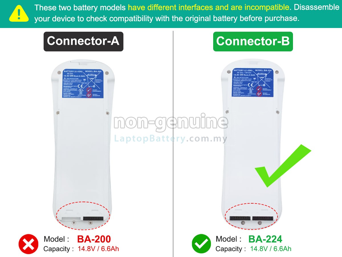 A:First, find out the part number of your old battery or the model name (e.g. 'Inogen ONE G2 PORTABLE OXYGEN CONCENTRATOR') and then match with our product compatibility table. Second, please compare your old battery with our product images to make sure their shapes are the same. Finally, check the voltage (rating) is the same as the old one.