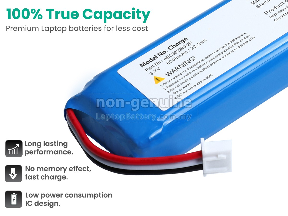 Our Website is your source of high-grade JBL speaker batteries! This brand new 22.2Wh(2 cells) replacement JBL AEC982999-2P Li-ion battery is made with high-grade cells from Samsung, LG and Panasonic to ensure maximum performance. The housing of the JBL AEC982999-2P battery pack is made of non flammable and very durable plastic, which is fire-retarded and nonperishable when dropped from low heights.