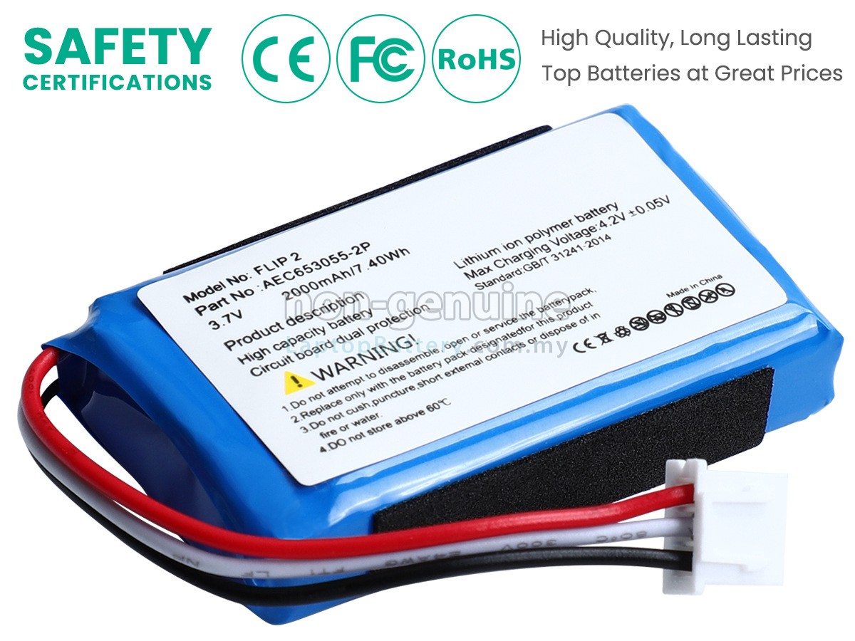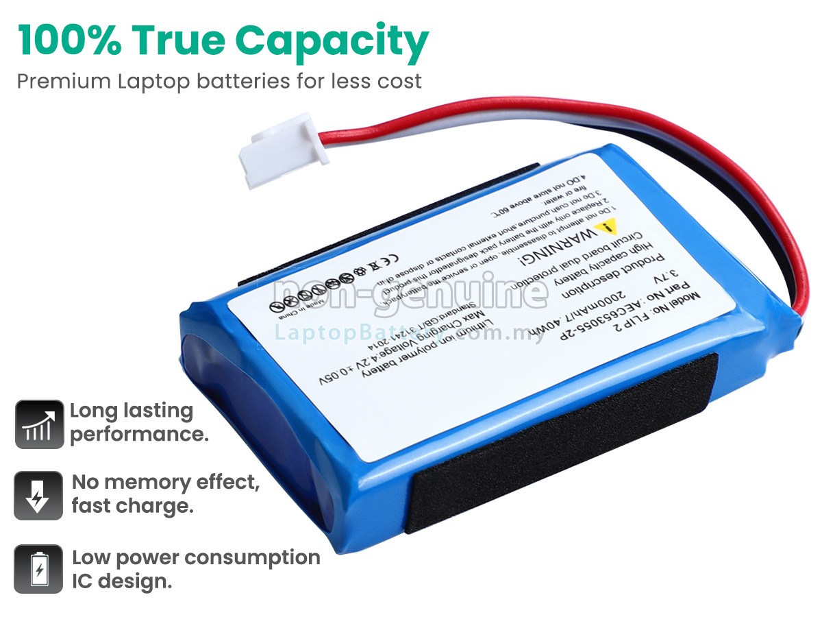 Our Website is your source of high-grade JBL speaker batteries! This brand new 7.4Wh(1 cells) replacement JBL FLIP2(2013) Li-ion battery is made with high-grade cells from Samsung, LG and Panasonic to ensure maximum performance. The housing of the JBL FLIP2(2013) battery pack is made of non flammable and very durable plastic, which is fire-retarded and nonperishable when dropped from low heights.