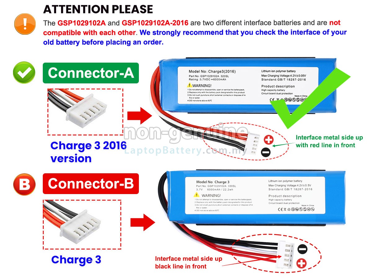A:First, find out the part number of your old battery or the model name of your speaker (e.g. 'JBL GSP1029102A') and then match with our product compatibility table. Second, please compare your old battery with our product images to make sure their shapes are the same. Finally, check the voltage (rating) is the same as the old one. For more details please click How to find one correct battery for my speaker?