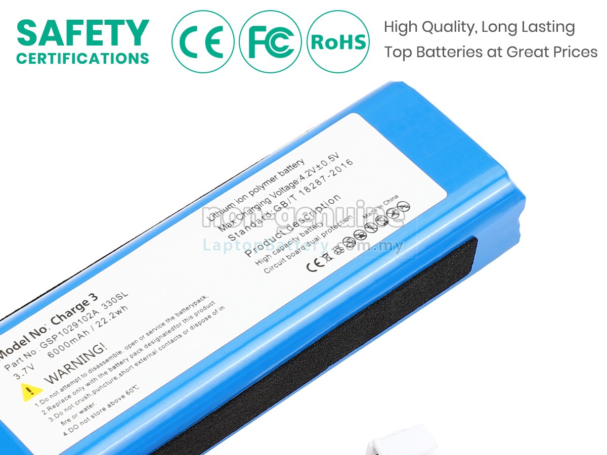 All our high-grade replacement batteries for JBL GSP1029102A speaker have been tested to prove that they can match or surpass original JBL battery performance and fit with Original Manufacturer's Specifications. In compliance with international standards, they obtain a series of rigorous safety certifications such as CE, UL, ROHS, ISO9001/9002. In general, this replacement JBL GSP1029102A battery can be charged/discharged up to more than 600 cycles.