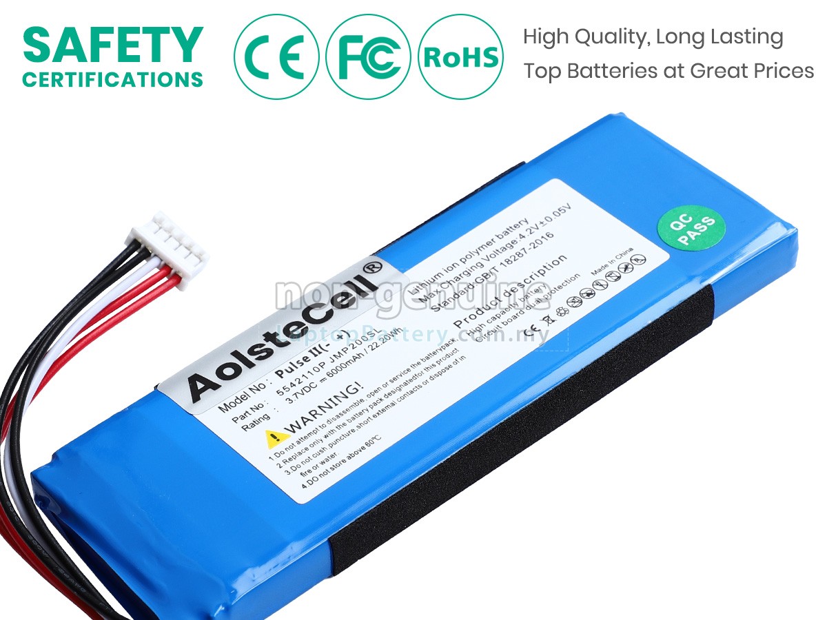 Our Website is your source of high-grade JBL speaker batteries! This brand new 22.2Wh(2 cells) replacement JBL PULSE 3 Li-ion battery is made with high-grade cells from Samsung, LG and Panasonic to ensure maximum performance. The housing of the JBL PULSE 3 battery pack is made of non flammable and very durable plastic, which is fire-retarded and nonperishable when dropped from low heights.