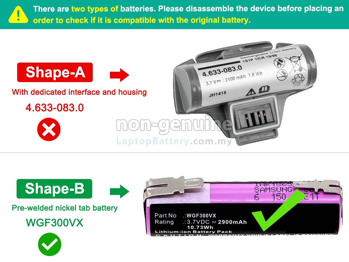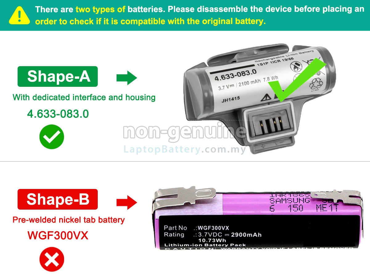A:First, find out the part number of your old battery or the model name of your vacuum cleaners (e.g. 'Karcher WV2 PREMIUM') and then match with our product compatibility table. Second, please compare your old battery with our product images to make sure their shapes are the same. Finally, check the voltage (rating) is the same as the old one. For more details please click How to find one correct battery for my Vacuum Cleaner?