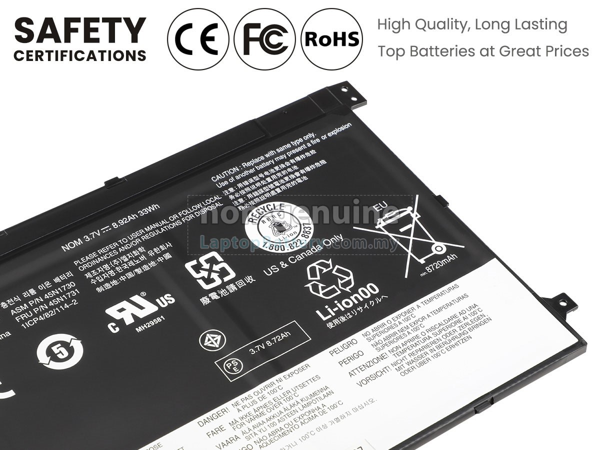 Our Website is your source of high-grade Lenovo laptop batteries! This brand new 33Wh(2 cells) replacement Lenovo 45N1728 Li-Polymer battery is made with high-grade cells from Samsung, LG and Panasonic to ensure maximum performance. The housing of the Lenovo 45N1728 battery pack is made of non flammable and very durable plastic, which is fire-retarded and nonperishable when dropped from low heights.