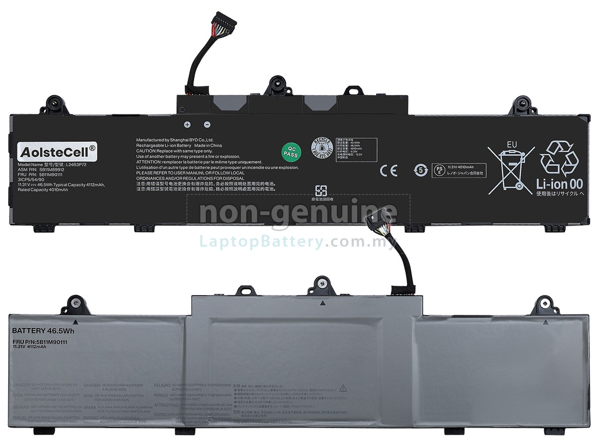 Our Website is your source of high-grade Lenovo laptop batteries! This brand new 46.5Wh(3 cells) replacement Lenovo 5B11M90109 Li-ion battery is made with high-grade cells from Samsung, LG and Panasonic to ensure maximum performance. The housing of the Lenovo 5B11M90109 battery pack is made of non flammable and very durable plastic, which is fire-retarded and nonperishable when dropped from low heights.