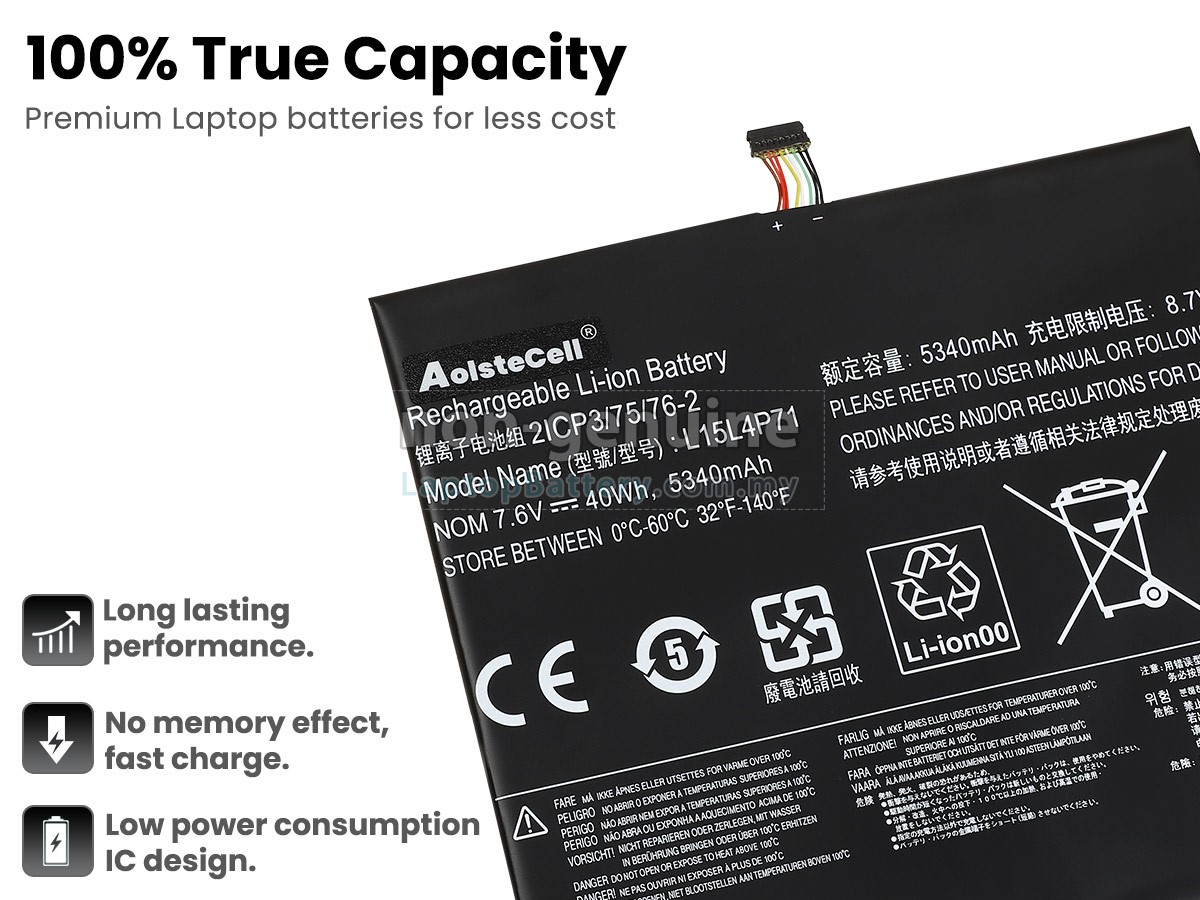 Our Website is your source of high-grade Lenovo laptop batteries! This brand new 40Wh(4 cells) replacement Lenovo L15L4P71 Li-Polymer battery is made with high-grade cells from Samsung, LG and Panasonic to ensure maximum performance. The housing of the Lenovo L15L4P71 battery pack is made of non flammable and very durable plastic, which is fire-retarded and nonperishable when dropped from low heights.