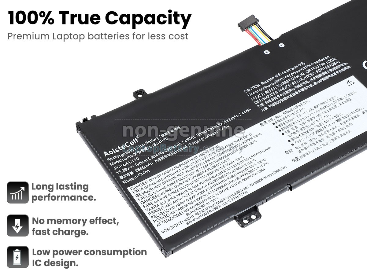 Our Website is your source of high-grade Lenovo laptop batteries! This brand new 45Wh(4 cells) replacement Lenovo L18C4PF0 Li-Polymer battery is made with high-grade cells from Samsung, LG and Panasonic to ensure maximum performance. The housing of the Lenovo L18C4PF0 battery pack is made of non flammable and very durable plastic, which is fire-retarded and nonperishable when dropped from low heights.