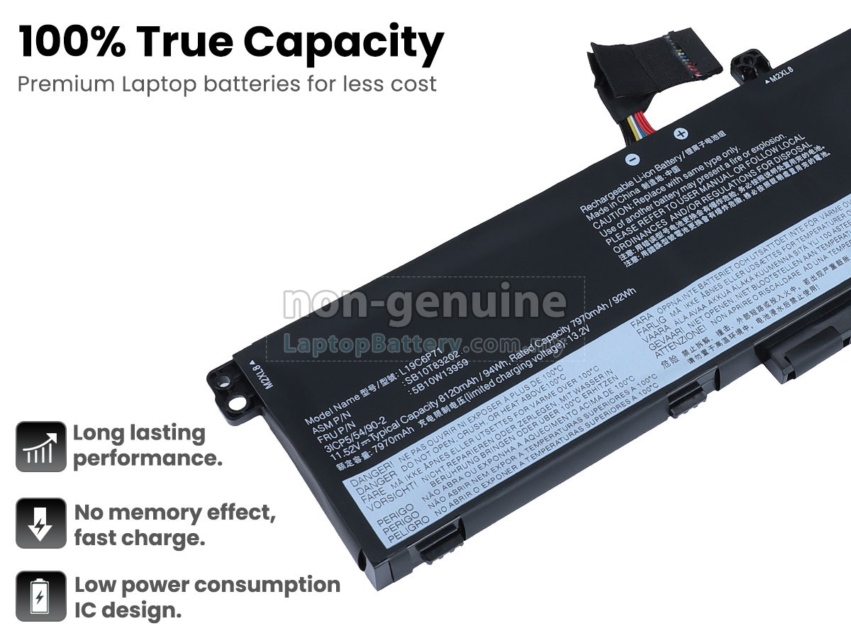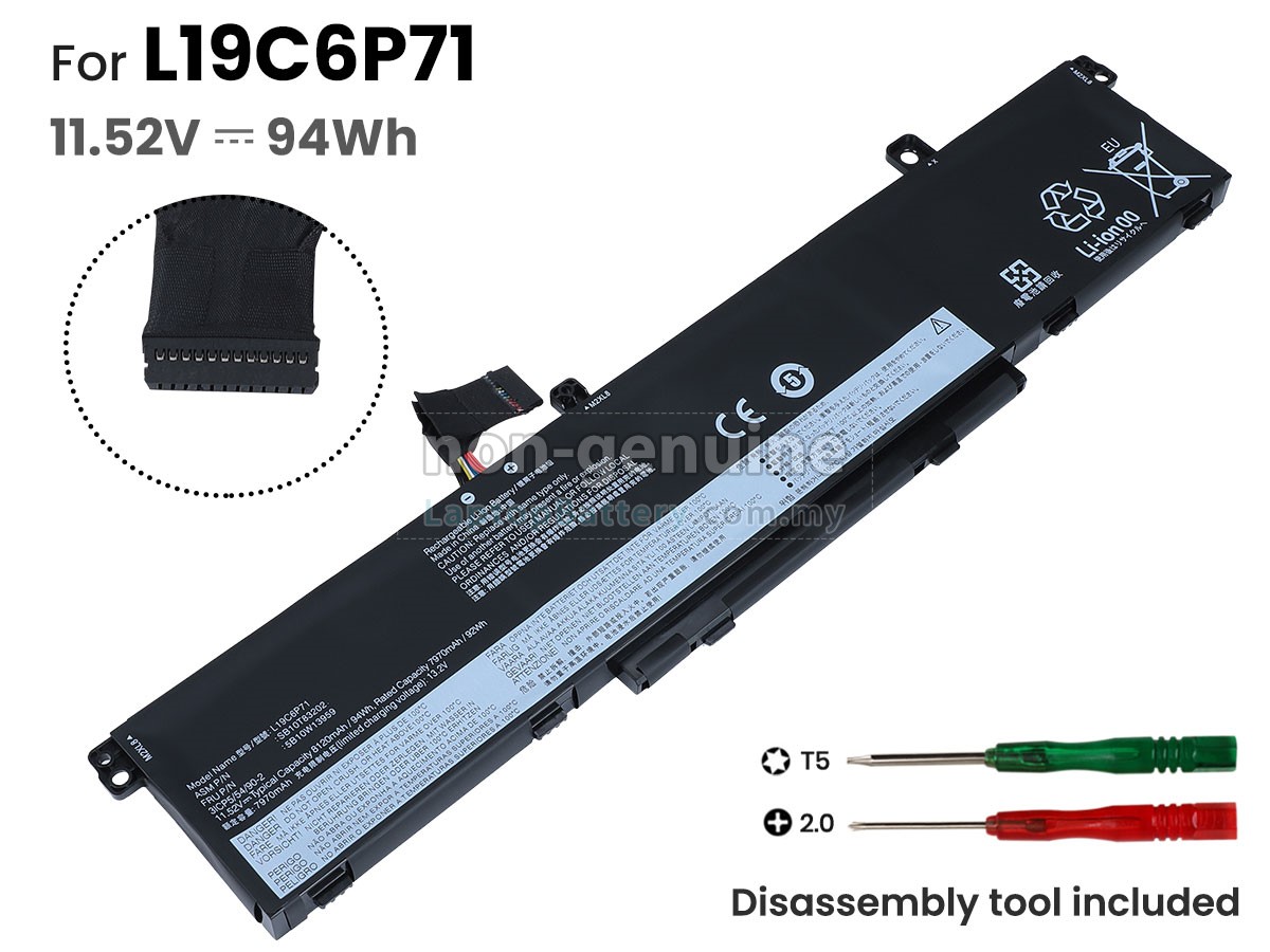 Our Website is your source of high-grade Lenovo laptop batteries! This brand new 94Wh(6 cells) replacement Lenovo L19L6P71 Li-Polymer battery is made with high-grade cells from Samsung, LG and Panasonic to ensure maximum performance. The housing of the Lenovo L19L6P71 battery pack is made of non flammable and very durable plastic, which is fire-retarded and nonperishable when dropped from low heights.